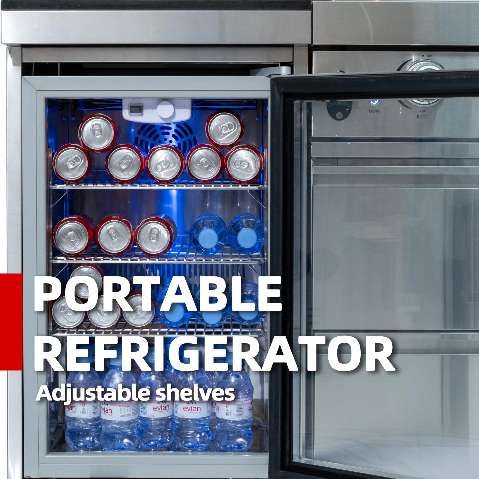 - Integrated Cooling & Storage Ecosystem Enhance your modular outdoor kitchen with a 68L stainless steel refrigerator featuring LED lit glass doors and 32°F 50°F temperature range. Three adjustable shelves store 60 cans, paired with lockable cabinets and storage drawers for utensils. The 304 stainless steel sink (1 cu.ft. capacity) completes this backyard kitchen station, ready for seafood prep or poolside beverage service.