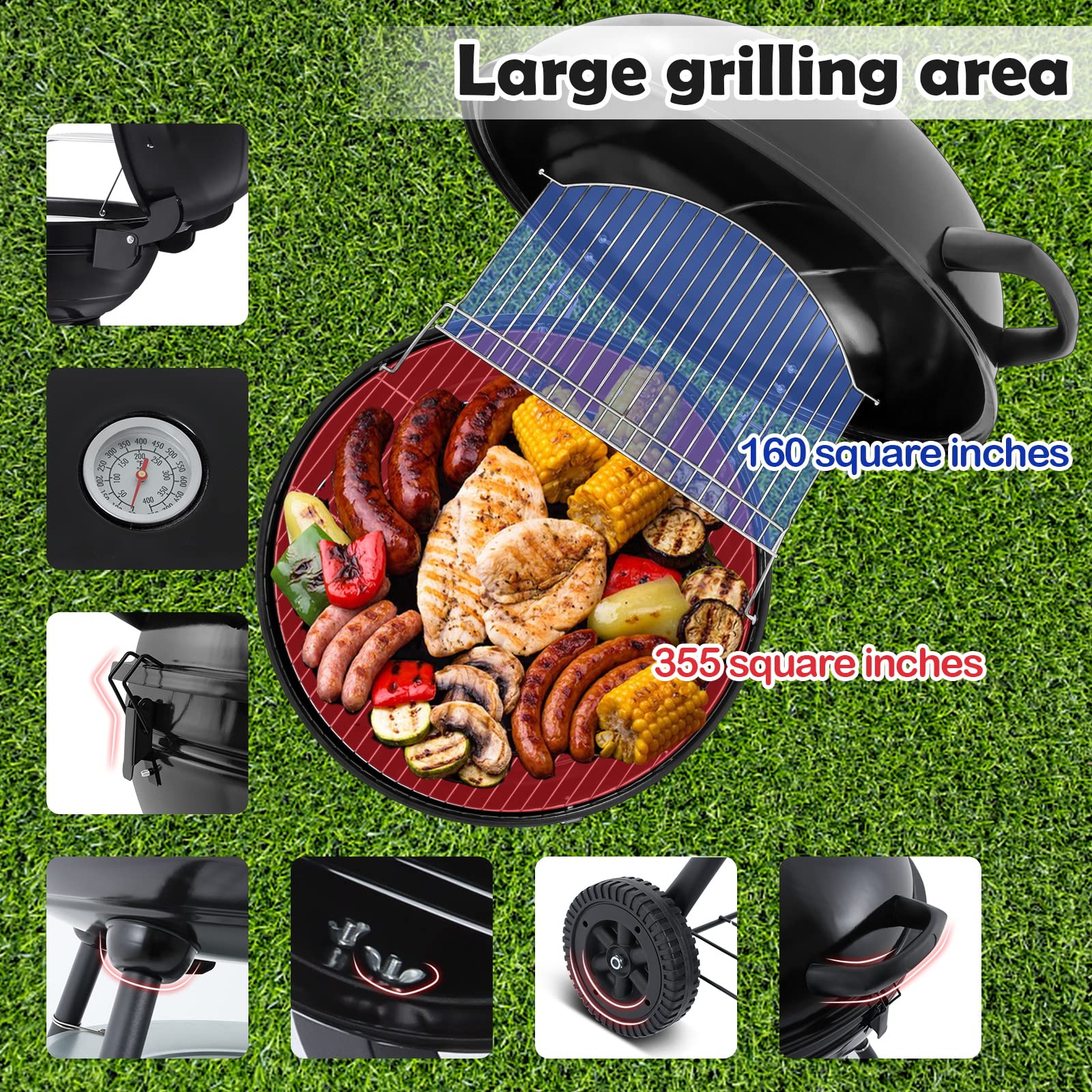 - [Durable Outdoor Grill] - Strong hinge up to 1.77mm thickness connect lid and fire bowl, ensures steady opening and closing without waggling, 322.5 square inches of rectangular support shelf can take all your grill tools without mess, Sturdy rack can hold up maximum 20 pounds of weight, Upgraded Double-sided plastic blowing wheels are durable and steady than other cheap one, metal bearing and gasket ensures smooth and flexible moving