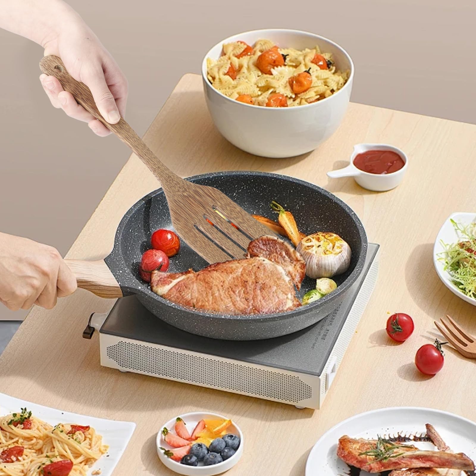 - 【3 Pack Wooden Cooking Spatulas】Set of 3 kitchen spatulas provide perfect sizes and shapes that meet all cooking and serving needs! Feel the comfortable and lightweight 12.3 inches long-handle spatula turner, the 12.3 inches slotted spatula, the12.8 inches long pan paddle. Each wood spatula works great at stirring items in non stick pans.