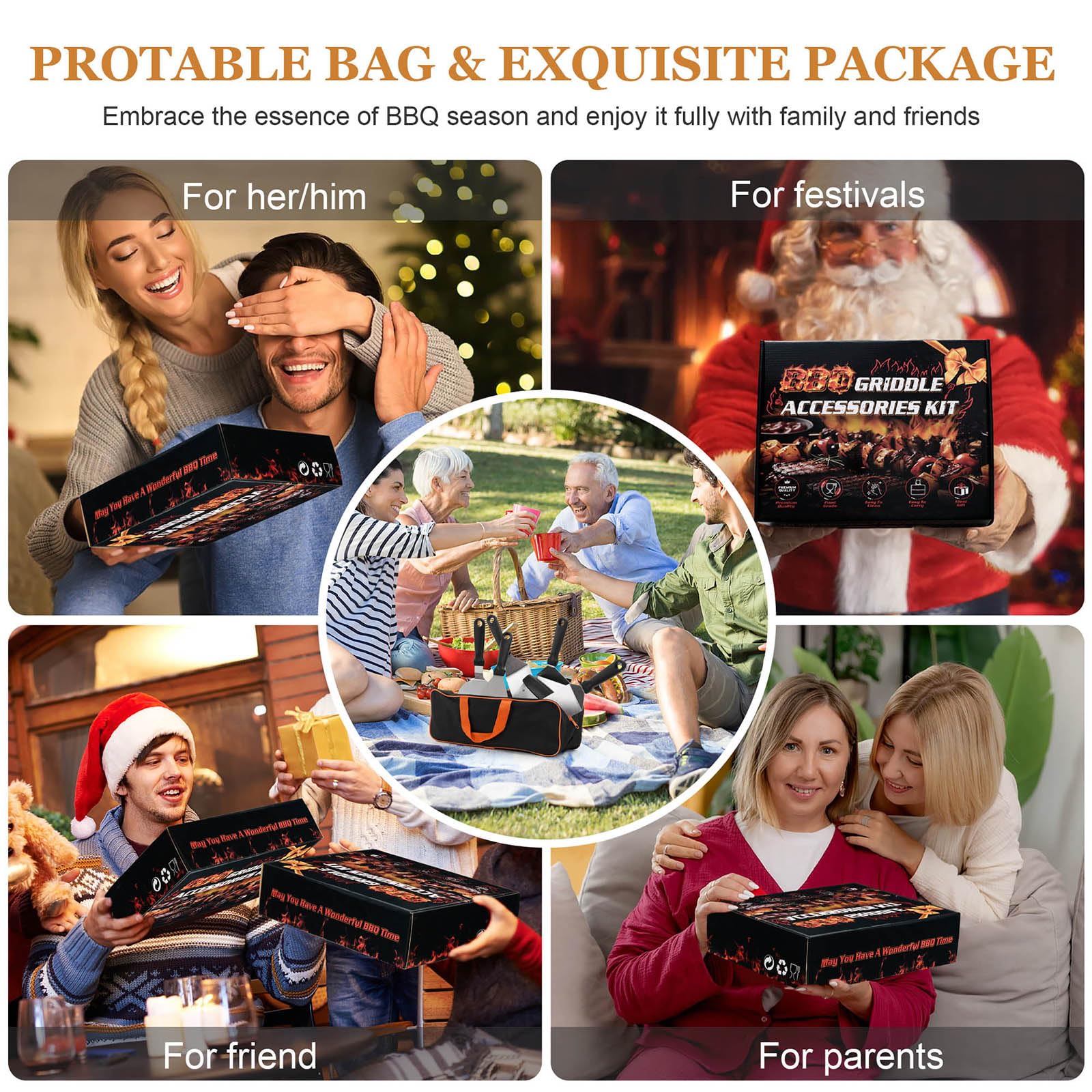 - 【Convenient to Store & Portable & Clean】Each griddle tool kit can be organized neatly and better protected within the compact storage bag. Convenient hangers are included for effortless storage, while food-grade griddle kit is dishwasher safe and can also be easily washed by hand with water and soap. This allows you to enjoy a delightful barbecue experience with your family without any hassle.