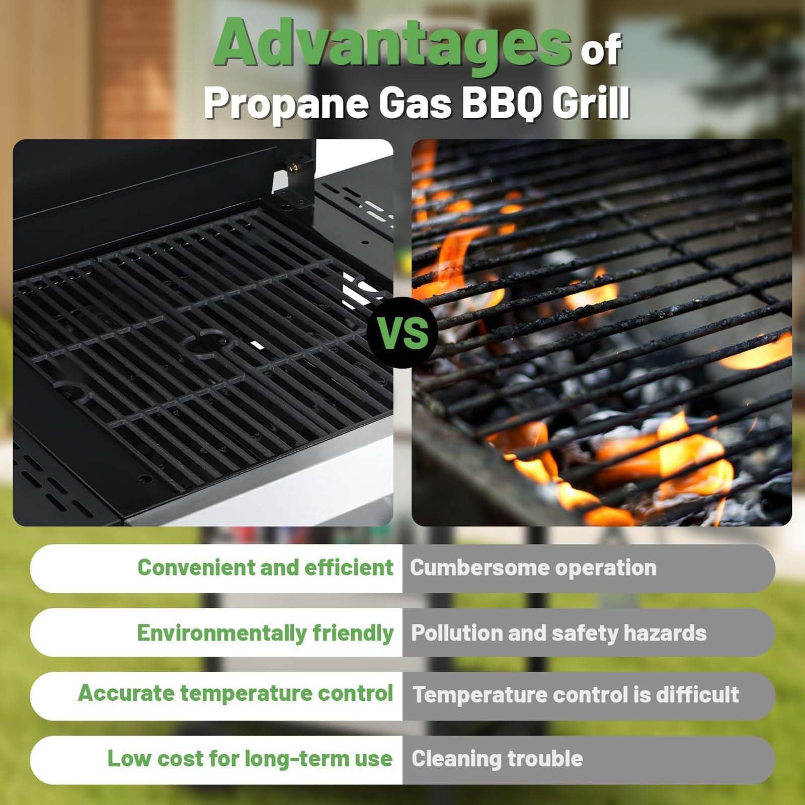 - 【Convenient Mobility and Safety】The outdoor grill is equipped with two 6-inch locking wheels and two sturdy legs. The legs keep the grill stable during cooking, preventing any sliding, while the wheels offer great convenience. You can easily push and pull the grill for smooth movement across grass, patios, or other outdoor areas.
