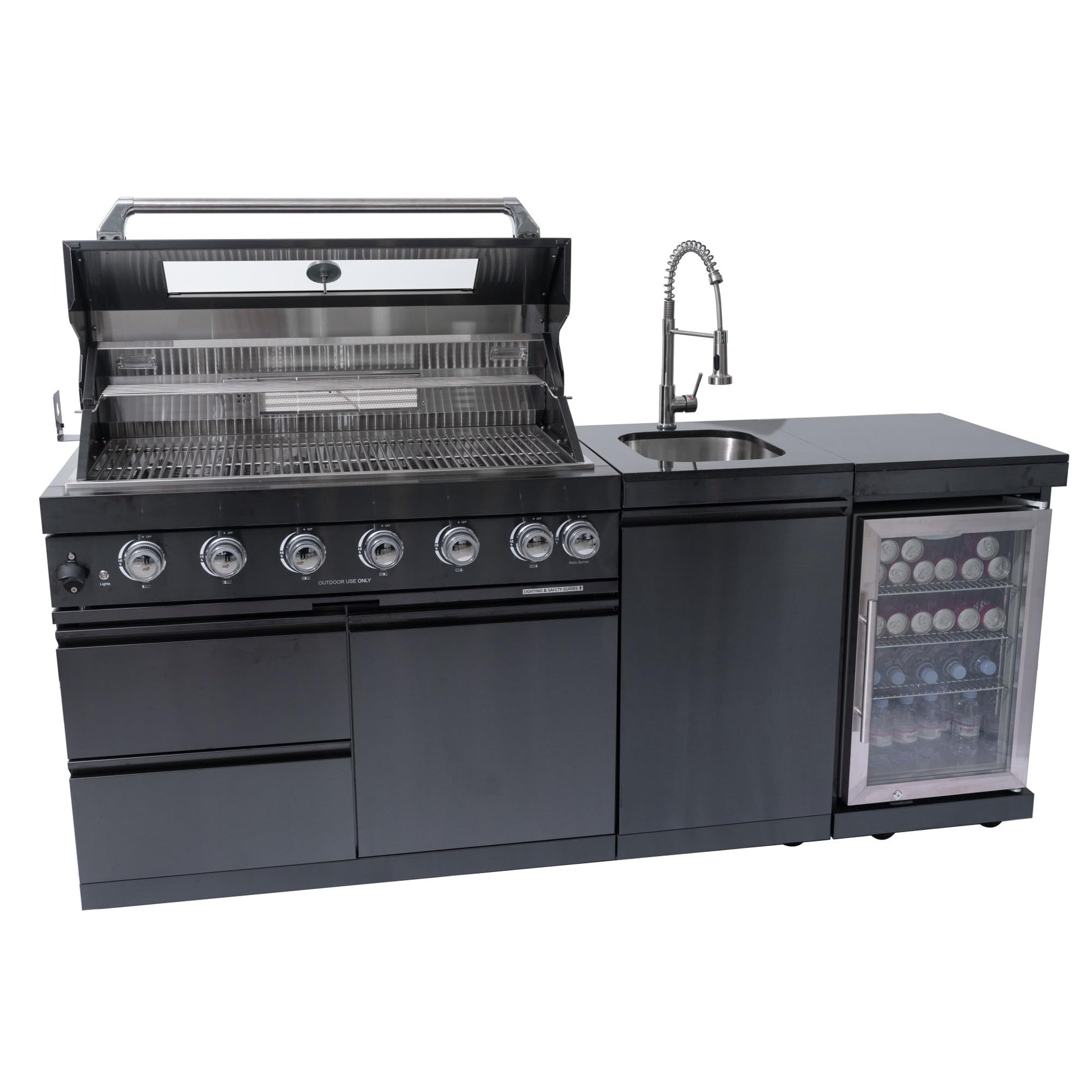 Equipped with premium features like a 120V electric motor rotisserie kit, dual LED-lit control knobs, and a built-in temperature gauge, this island ensures precise cooking every time. The integrated stainless steel sink with a 360° swivel faucet enables quick rinsing and cleanup, while the 68L refrigerator keeps beverages cold and perishables fresh, thanks to adjustable shelves and a wide temperature range of 0°C–10°C.