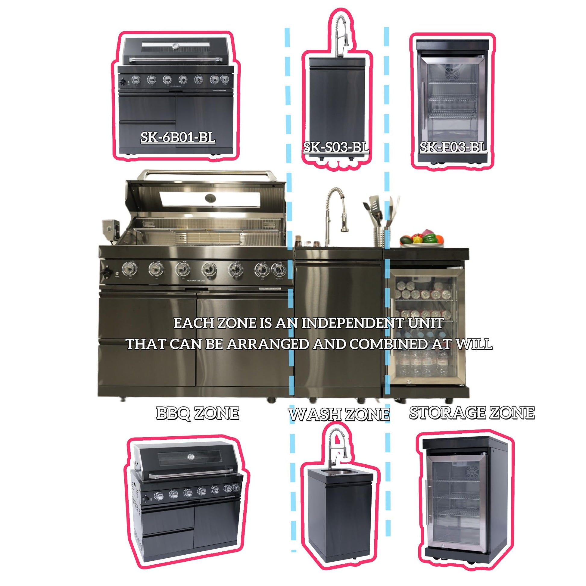 - ★ MODULAR ZONE DESIGN – Independent BBQ, Wash, and Storage zones can be arranged freely to fit your outdoor layout. Each section is a standalone unit including grill, sink, and refrigerator modules. This customizable configuration allows for flexible installation and better space usage in your backyard, patio, or garden entertainment area.
