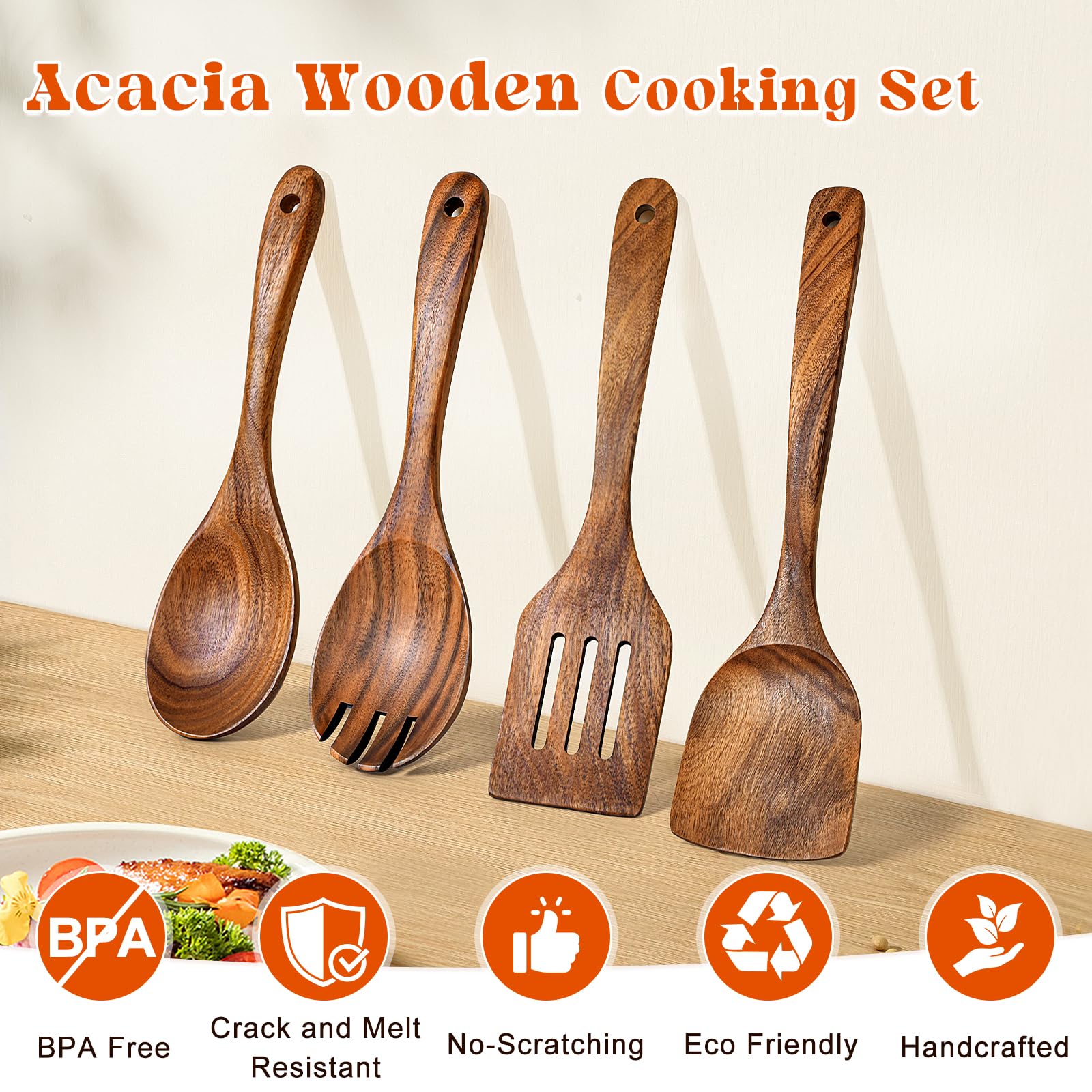 - 【Eco-Friendly Wooden Utensil Set】 Our cooking utensils set is made of natural acacia wood, which is healthy and safe. It it known for its dense grain and natural resilience, making these kitchen utensils crack-resistant, heat-resistant, will not melt due to high temperature like rubber one. Besides, acacia is completely biodegradable, using this wooden spatula reduces reliance on plastics, helps minimize environmental impact, and ensures safety for both you and the planet.
