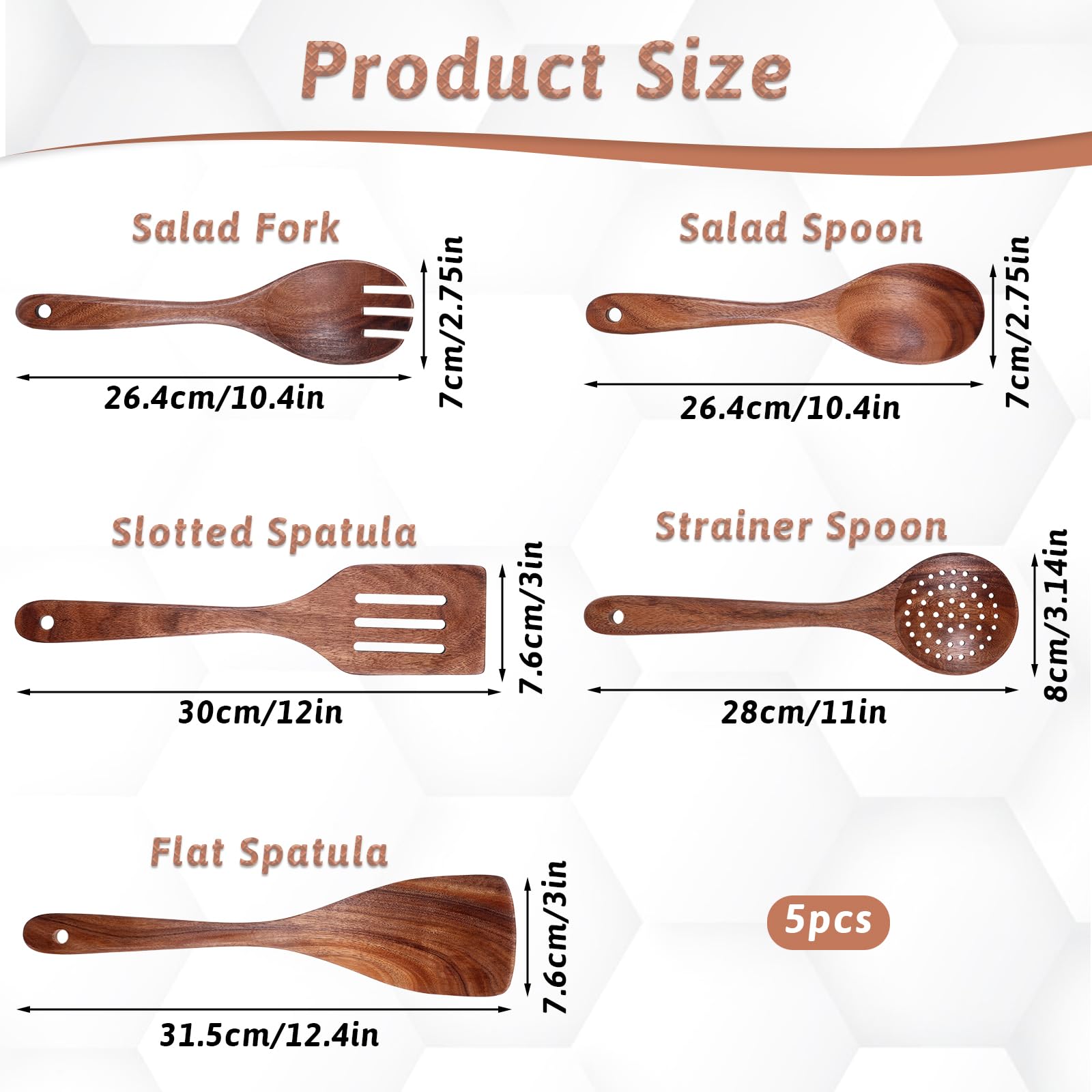 - 5-Piece Cutlery Set: This set includes five essential kitchen tools: 12.4-inch flat spatula, 12-inch slotted spatula, 11-inch strainer spoon, 10.4-inch salad spoon, and 10.4-inch salad fork