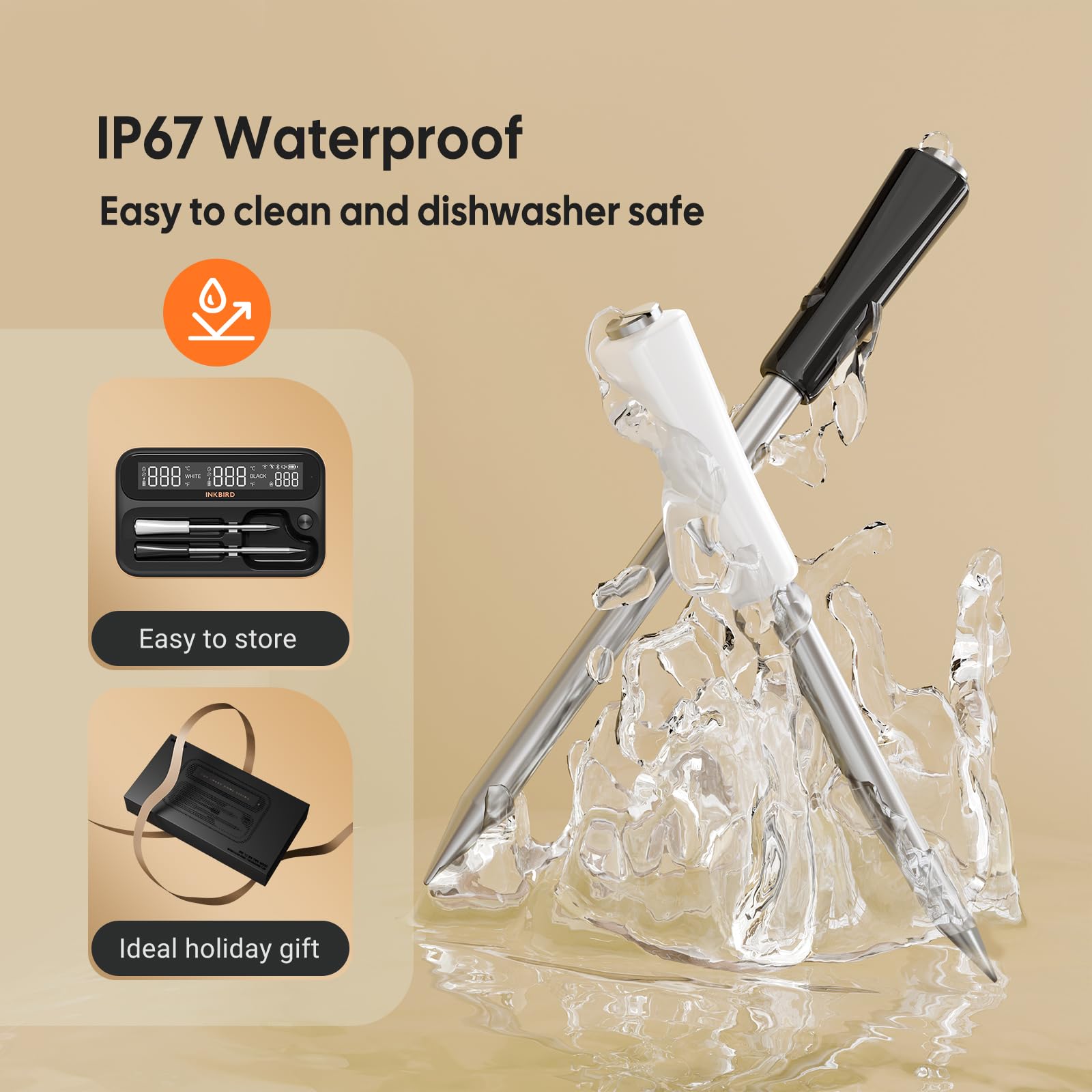 - IP67 WATERPROOF EASY FOR Clean AND STORAGE: The DUAL grill meat thermometer probes are IP67 waterproof and food-grade stainless steel and with zirconia unglazed ceramic handles, heat-resistant, and wear-resistant, easy to be cleaned in a dishwasher.The case can be storaged the probes neat and tidy