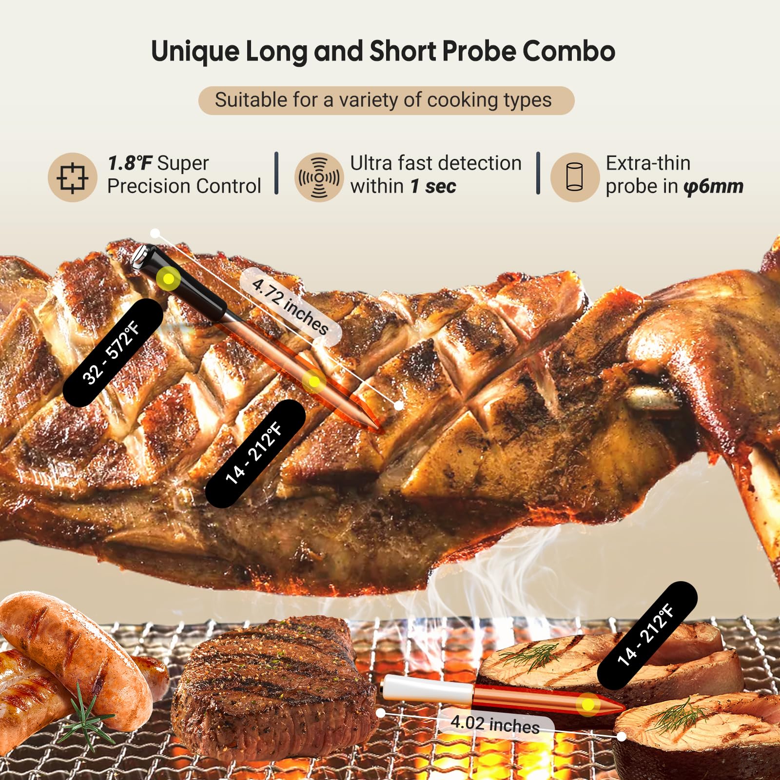 - 4.72 INCHES LONG AND 4.02 INCHER SHORT PROBES: long probe for thick steaks and short probe for delicate fish,suit for all kind of meal. The temperature accuracy of this digital wifi Bluetooth thermometers is T ±1°C/±1.8°F accuracy and ±12℉ calibation for precise remote monitoring