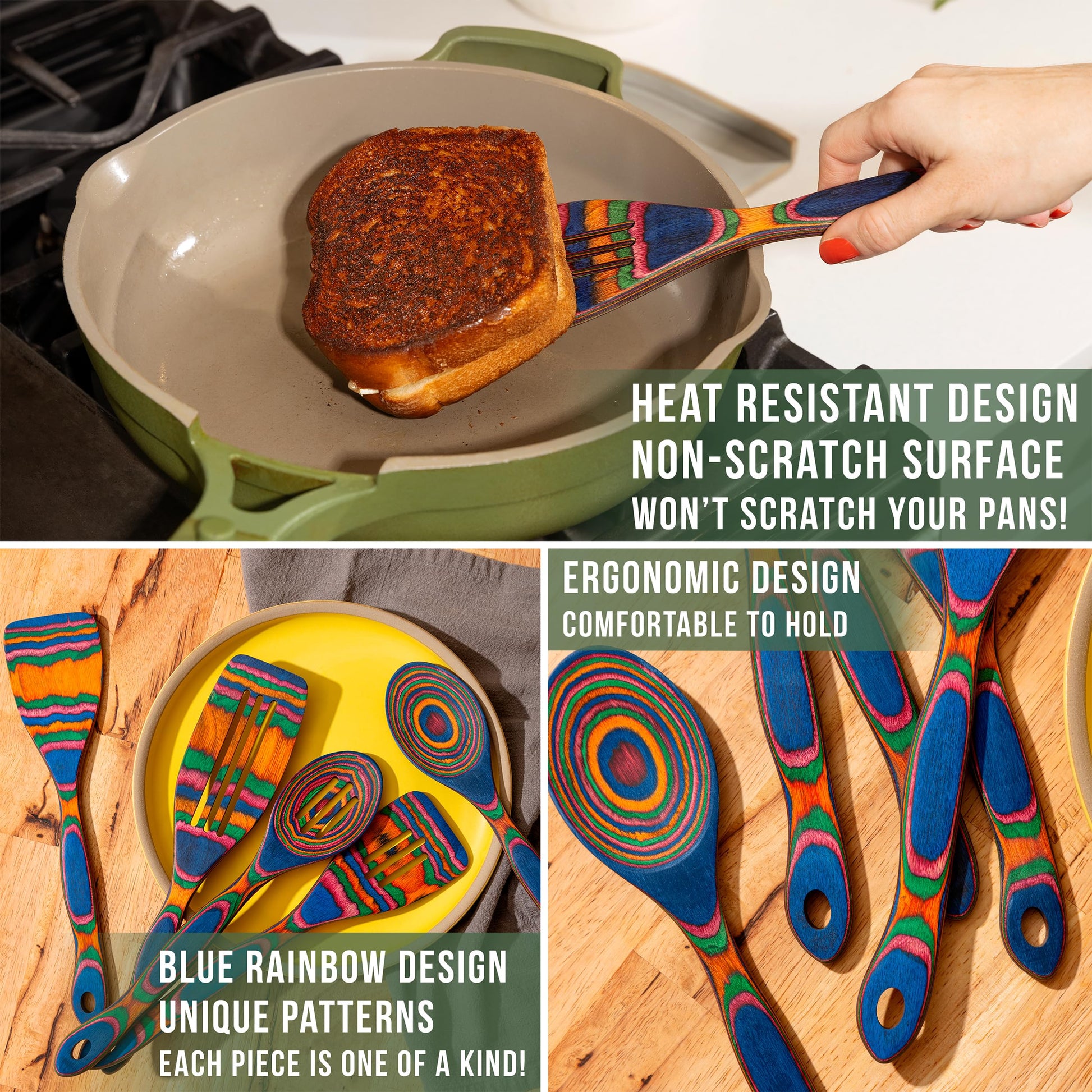 - Stylish and Functional: Elevate your kitchen decor with this wooden spoon sets for cooking. Featuring a vibrant pakkawood finish, these utensils blend style and practicality, making them a must-have for wooden kitchen utensils enthusiasts.