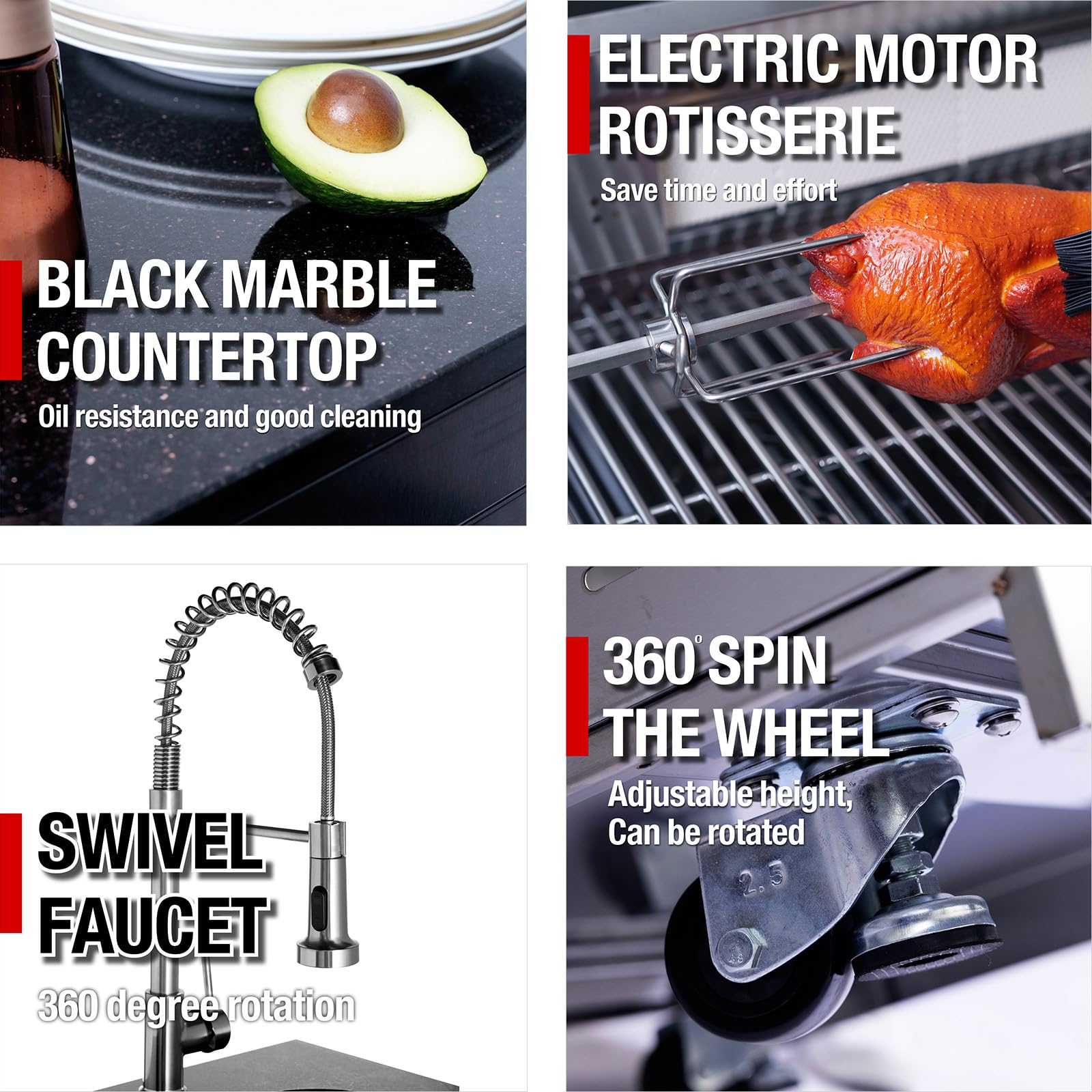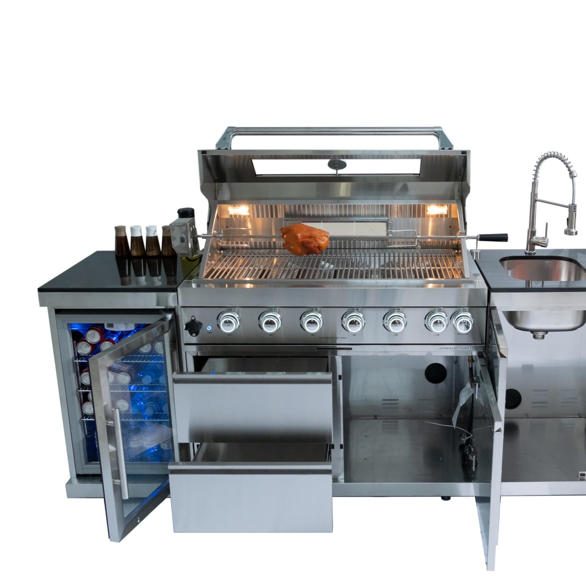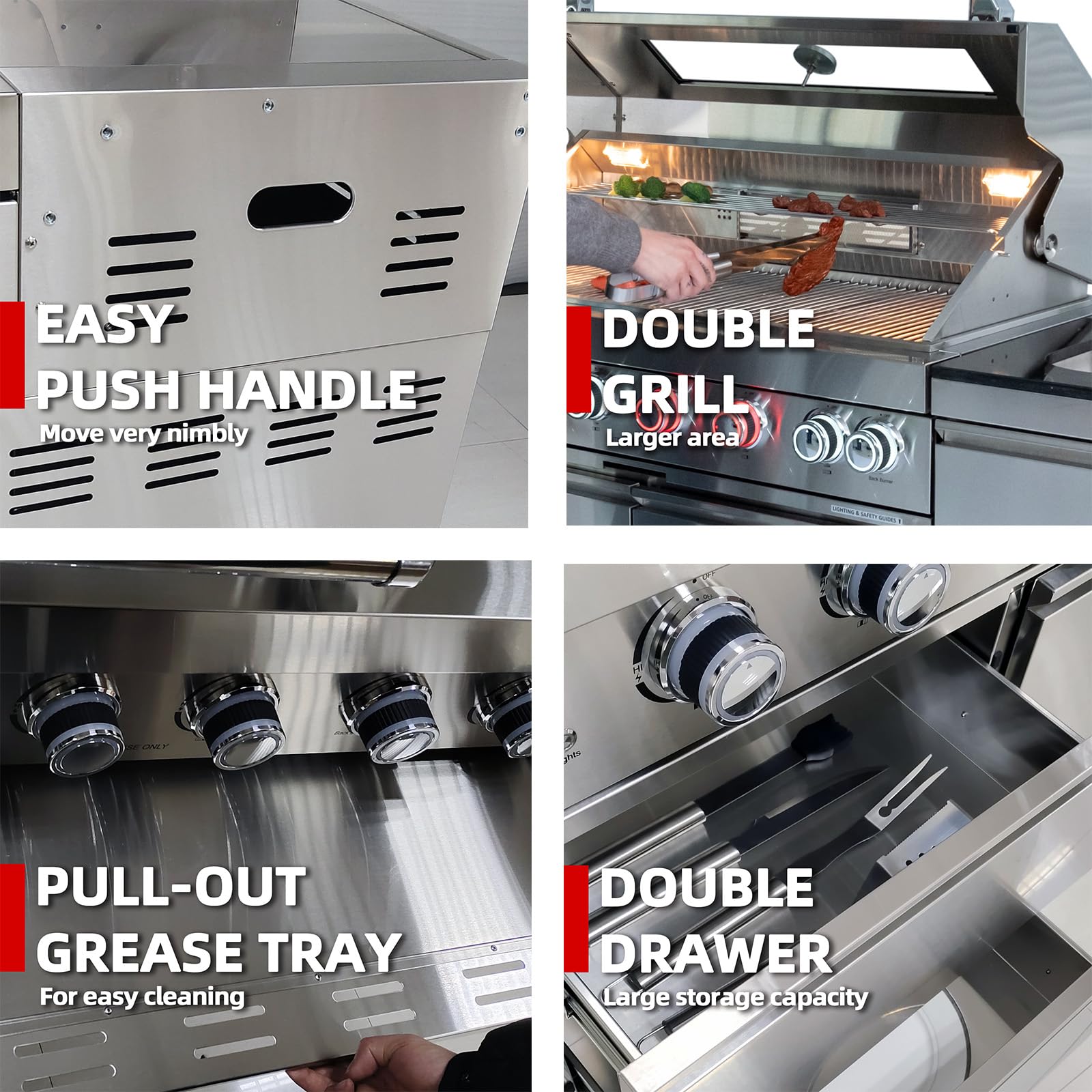 - Enhanced Convenience Design: Equipped with a double-lined grill hood and temperature gauge to lock in heat, two halogen cooking lights, and on/off red/white control knob lights for visibility at night. Enjoy added perks like an integrated bottle opener, electronic ignition, an easy-to-clean full front pull-out grease tray, black granite countertops, storage drawers, and cabinets. Gliding castor wheels ensure effortless mobility and stability
