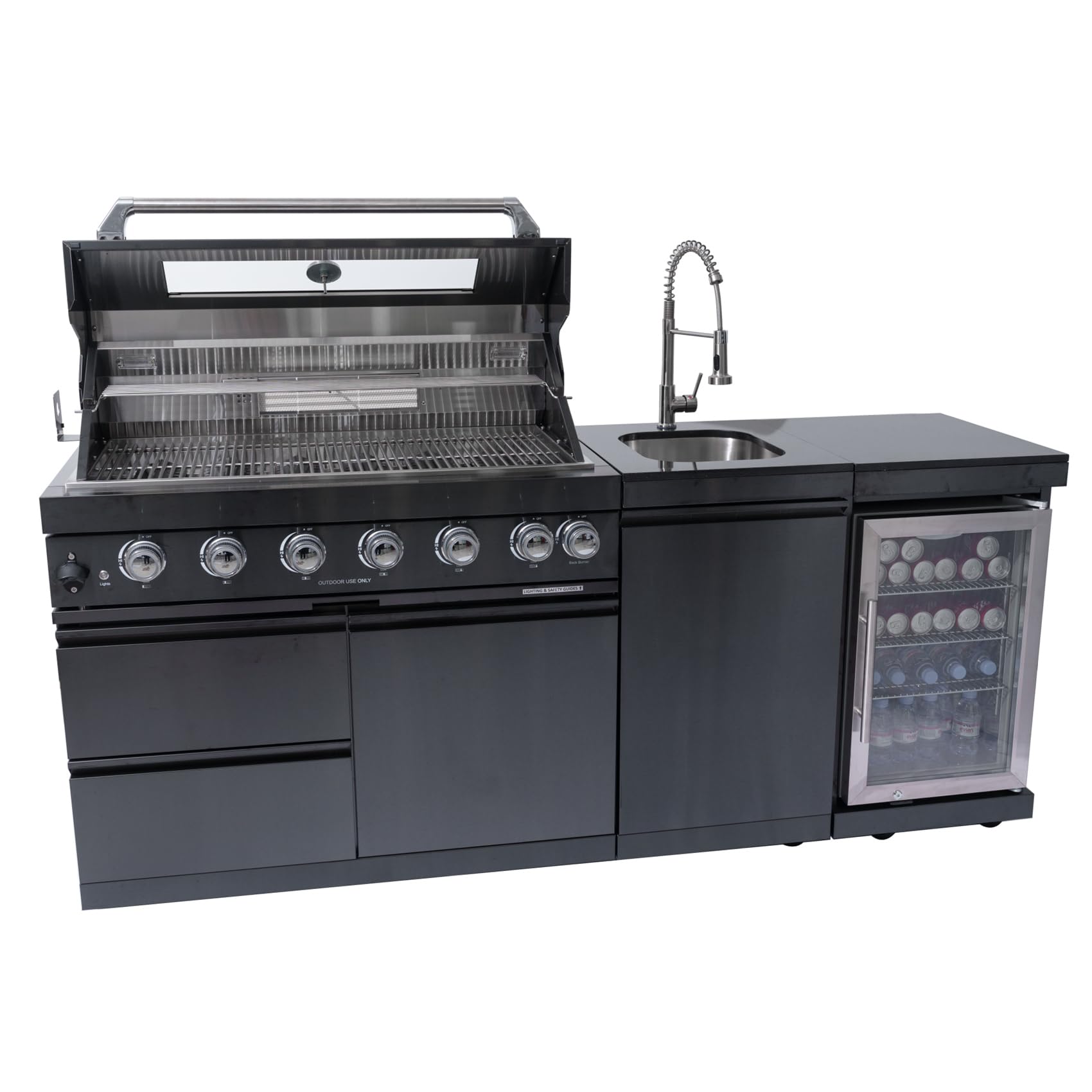 - β π«ππππππ πΆπππ πππ πͺππππ: Built to last, this modular outdoor kitchen features 304 marine-grade stainless steel and corrosion-resistant materials, enduring sun, rain, and salt air. A sleek black finish adds modern elegance. With a double-lined hood, built-in thermometer, and halogen lighting, it ensures consistent grilling performance year-round