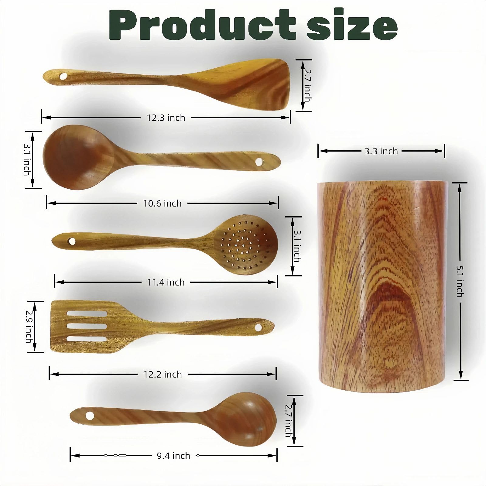 - Wooden Utensil Holder:Our wooden spoons comes with a Wooden Utensil Holder, a unique feature that sets it apart from other products on the market. The holder even has a leak hole at the bottom to prevent water accumulation