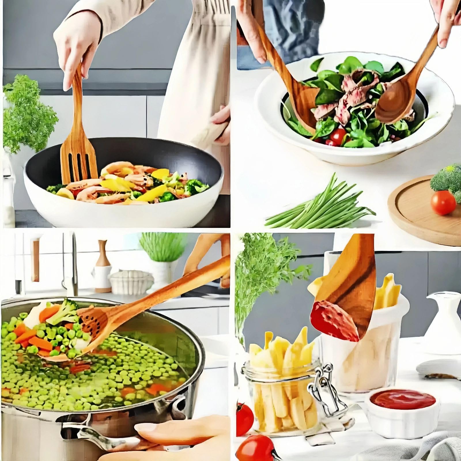 - Beautiful and practical: Wooden kitchen utensils have a wood grain color, adding a warm and natural beauty to the kitchen. At the same time, they are easy to clean and maintain, making them a practical decoration for the kitchen