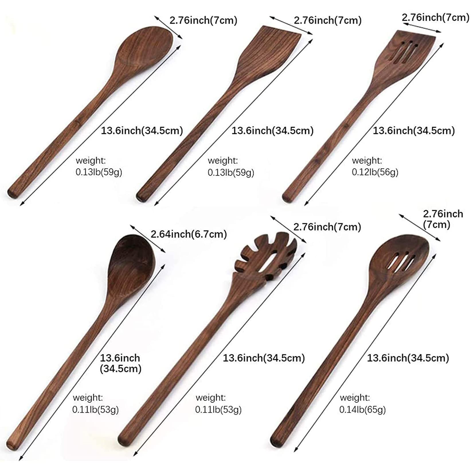 - 1.6PCS Handmade Wooden Cooking Utensils- This Wooden Utensils made from natural black walnut wood, including soup ladle,Corner Spoon,Cooking Spoon, Slotted Spoon,Spatula ,Slotted Spatula,spaghetti spoon.The black walnuti's texture is unique, and each of them is a gift of nature