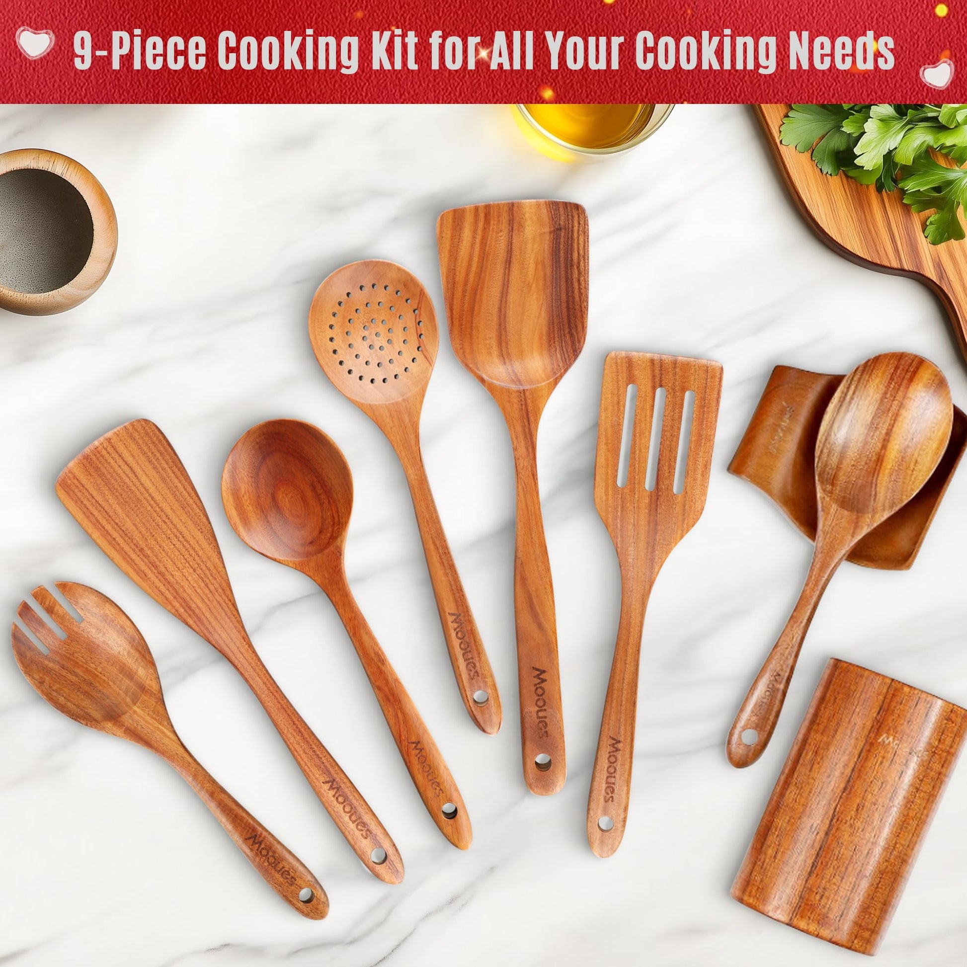 9 Piece Wooden Spoons for Cooking, Teak Wooden Kitchen Utensils Set with Spoon Rest, NonStick Comfort Grip Wooden Spatula Set and Cooking Utensils Holder