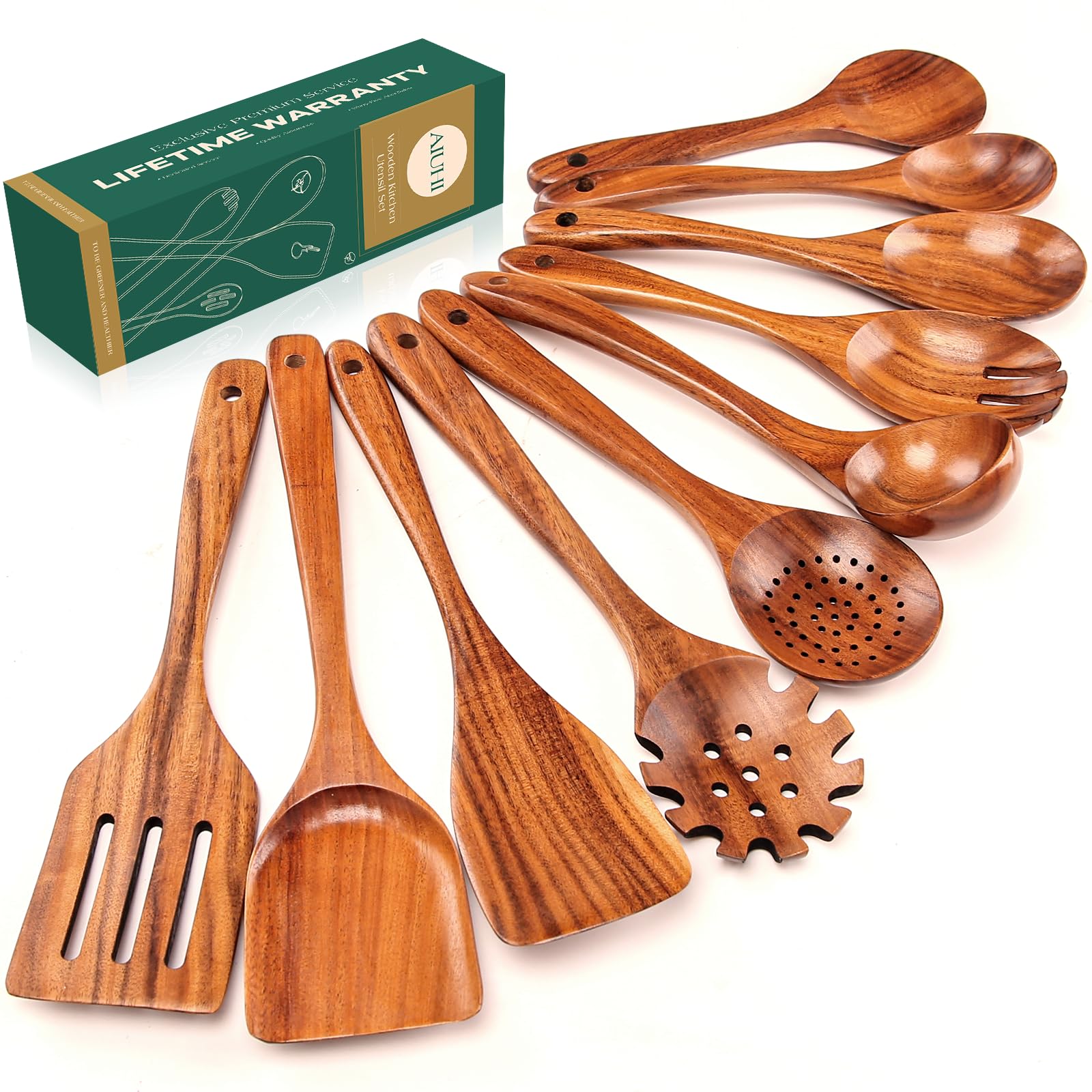 AIUHI Wooden Kitchen Utensils Set, No Scratch Wood Spatula and Spoon Set, Teak Wood Cooking Utensils Set for Kitchen Essential Tools 10 Pieces