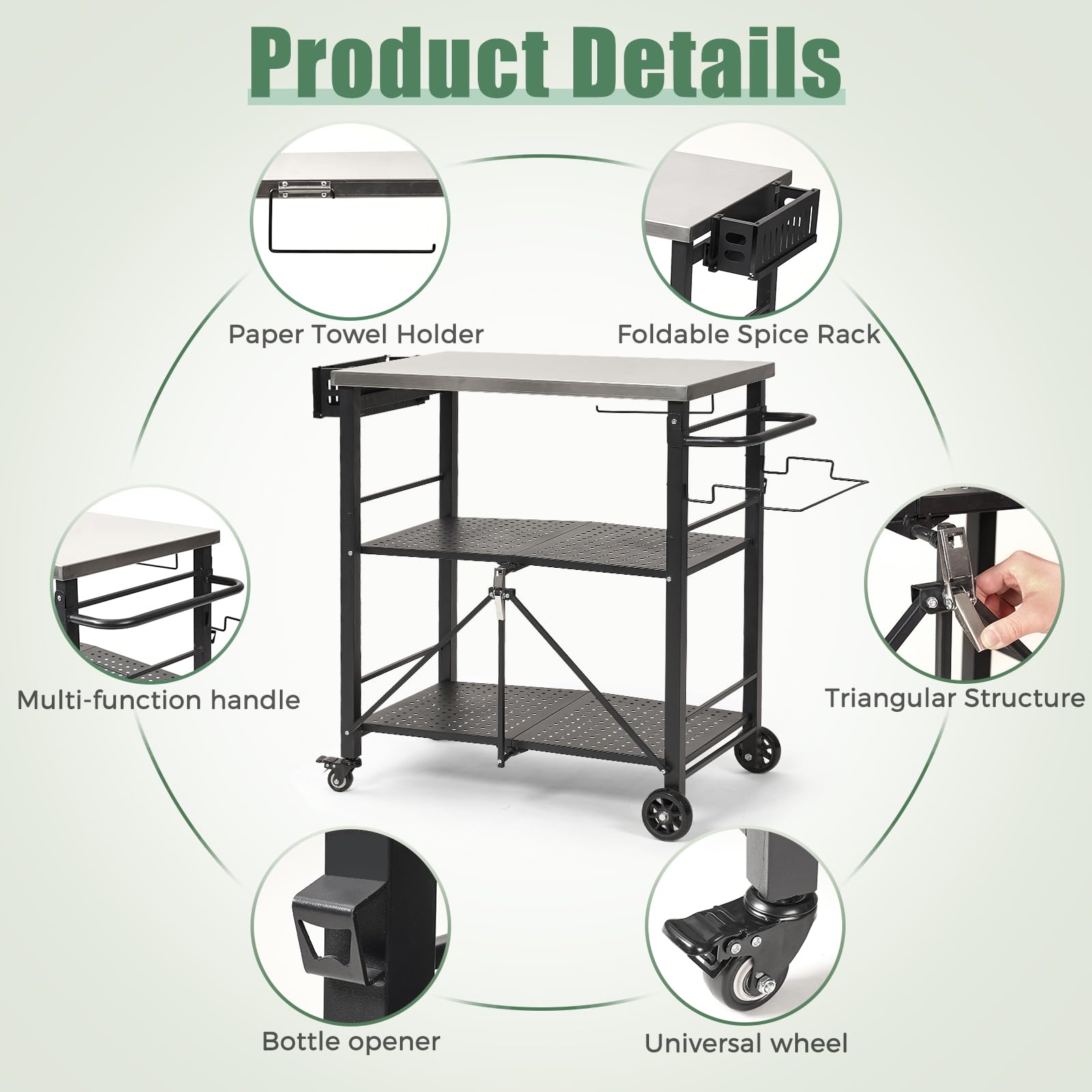 - 【Multi-functional Grill Cart】Our grill cart is equipped with a seasoning box,which can be used to hold various seasonings,and the bottle opener,paper towel holder and garbage bag holder are perfectly matched