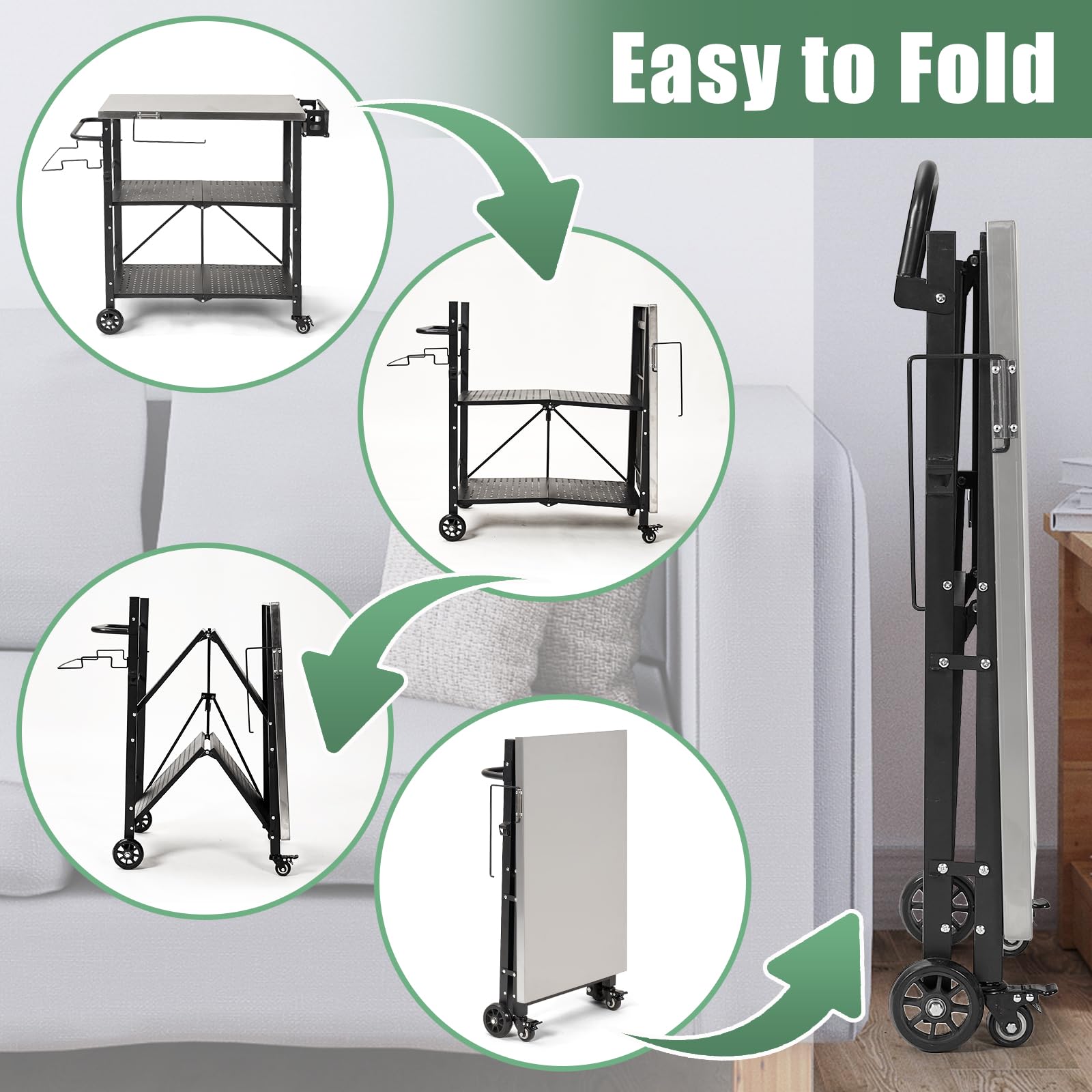- 【Portable Folding Grill Table Cart】This grill cart adopts a convenient foldable design,It can be unfolded and folded in four simple steps.After folding,it is small and can be easily put into the trunk of a car or the corner of the house.It is an ideal choice for families who often grill outdoors