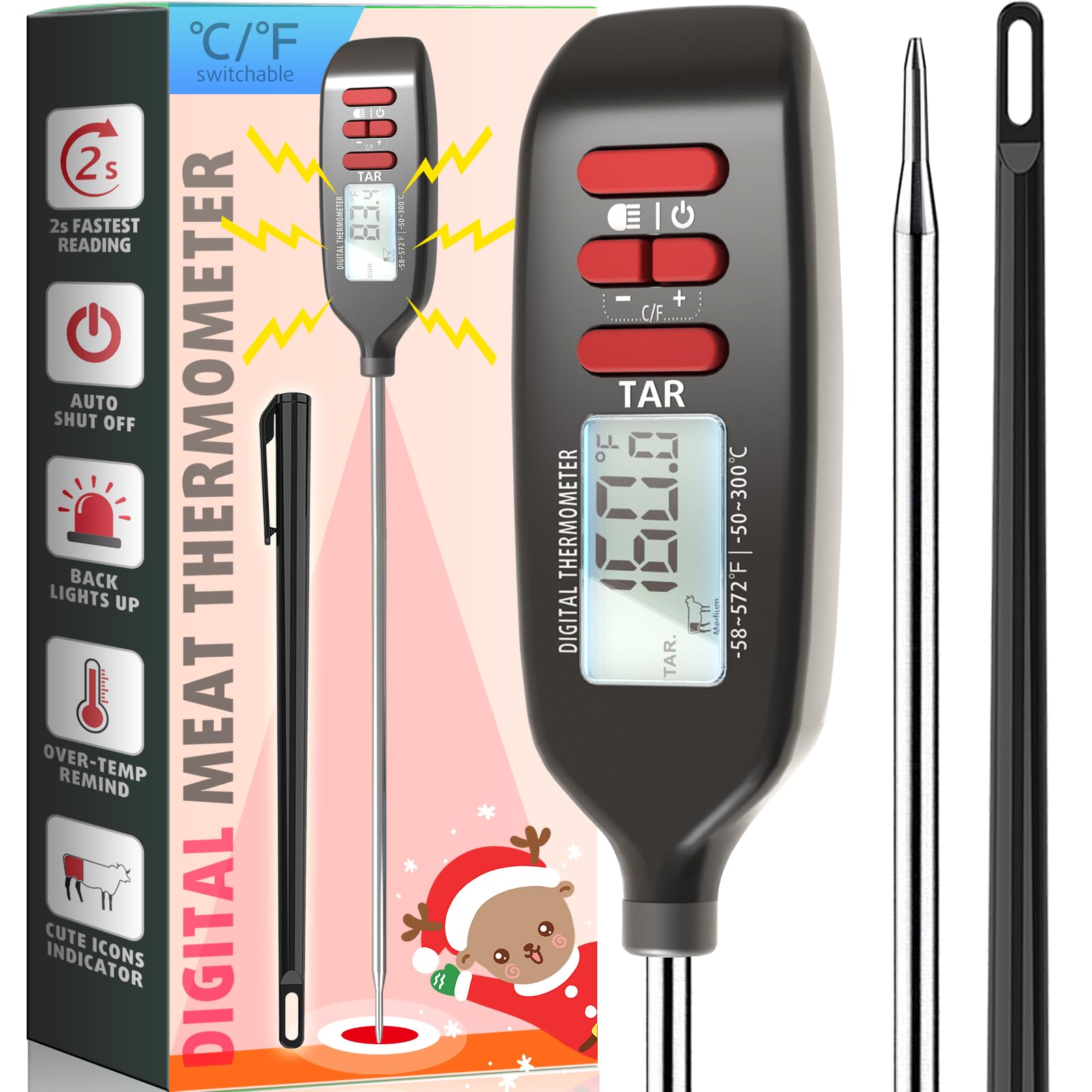- [ Wide variety of uses ]: With wide temperature range from -58°F ~ +572°F, accuracy ±1.8°F. This multi-use cooking thermometer ideal for grilling meats, candy making, deep frying, measuring liquids, baking bread, pizza crust, cakes, and other desserts. (℉/℃ switch in one tap) (You will get: 1 x Meat Thermometer, 1 x Probe Sheath, 1 x Battery.)