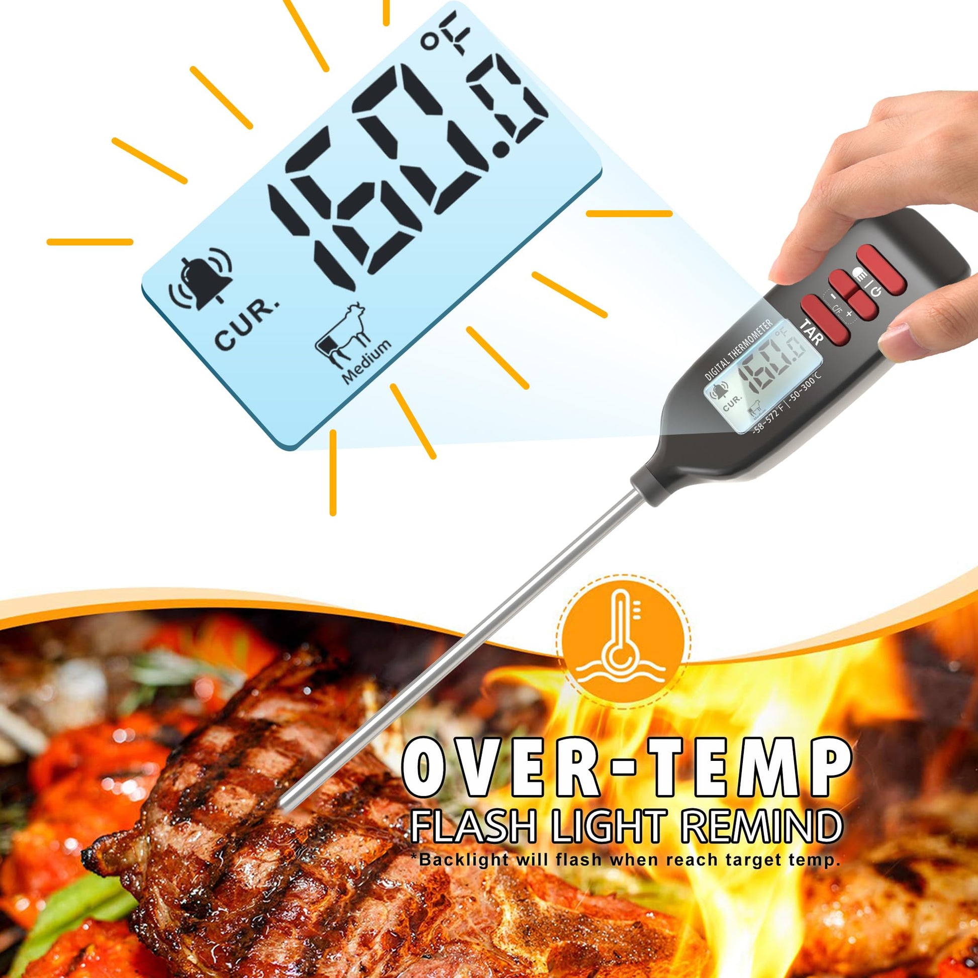- [ Over-temperature Remind ] Choose and set your target temperature with this digital food thermometer, when current food temp reaches the target setting, the backlight will flash to remind you. Measuring range: -58~572°F