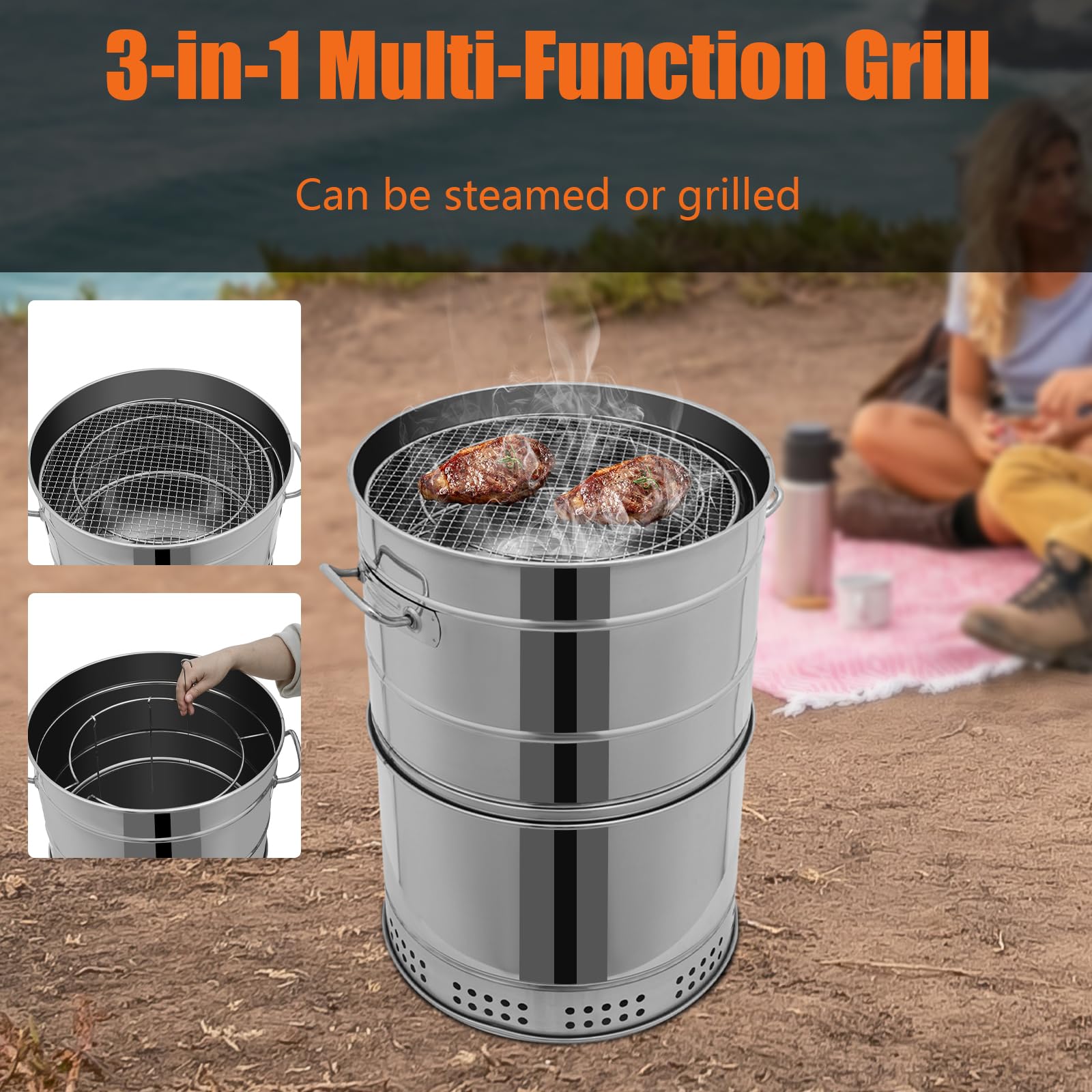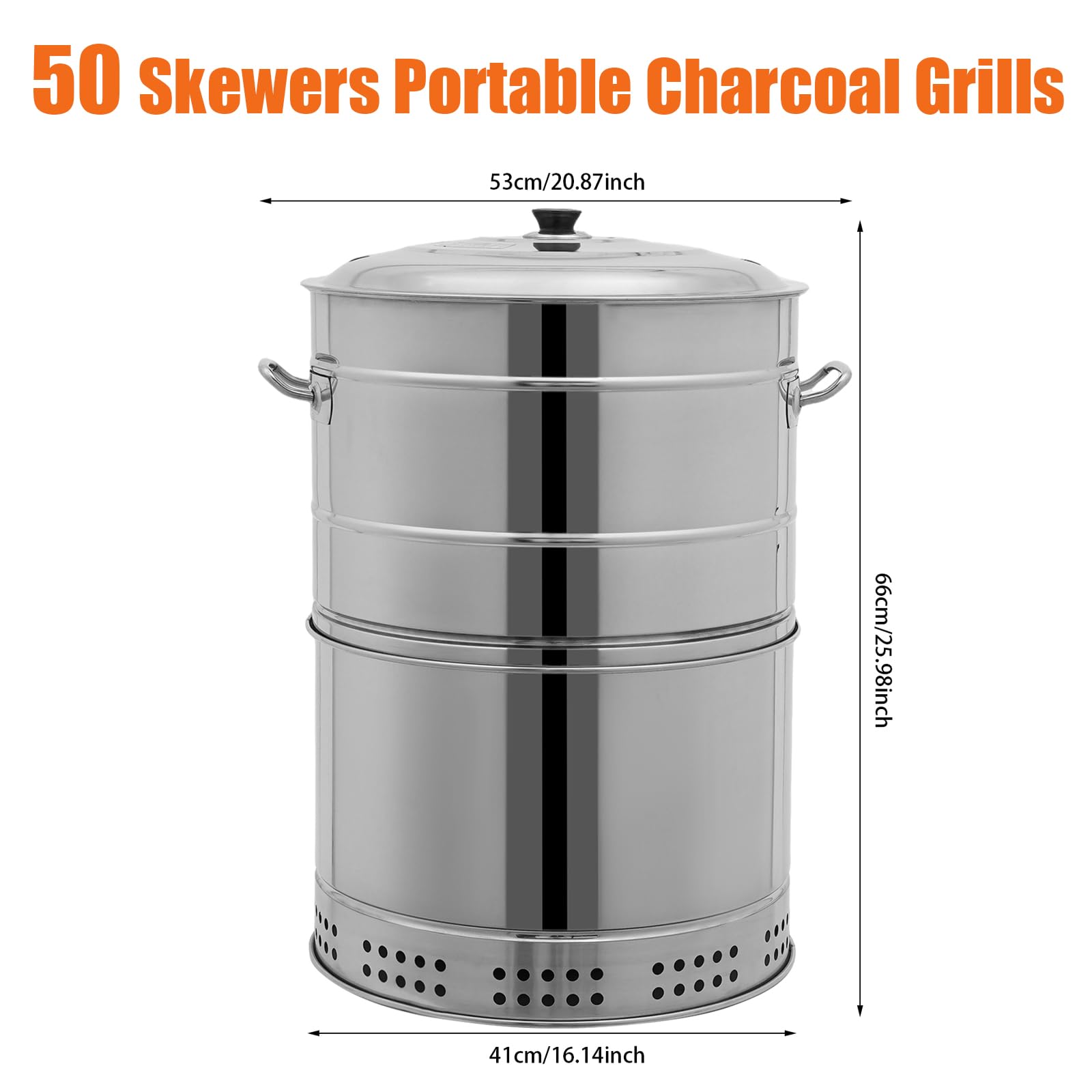 BAIODNB Large Portable Charcoal Grills, Stainless Charcoal BBQ Grill Barrel 360° Smokeless Outdoor with 50 Skewers, Boiling Pot Barbecue Smoker Grill for Travel, Outdoor Cooking and BBQ