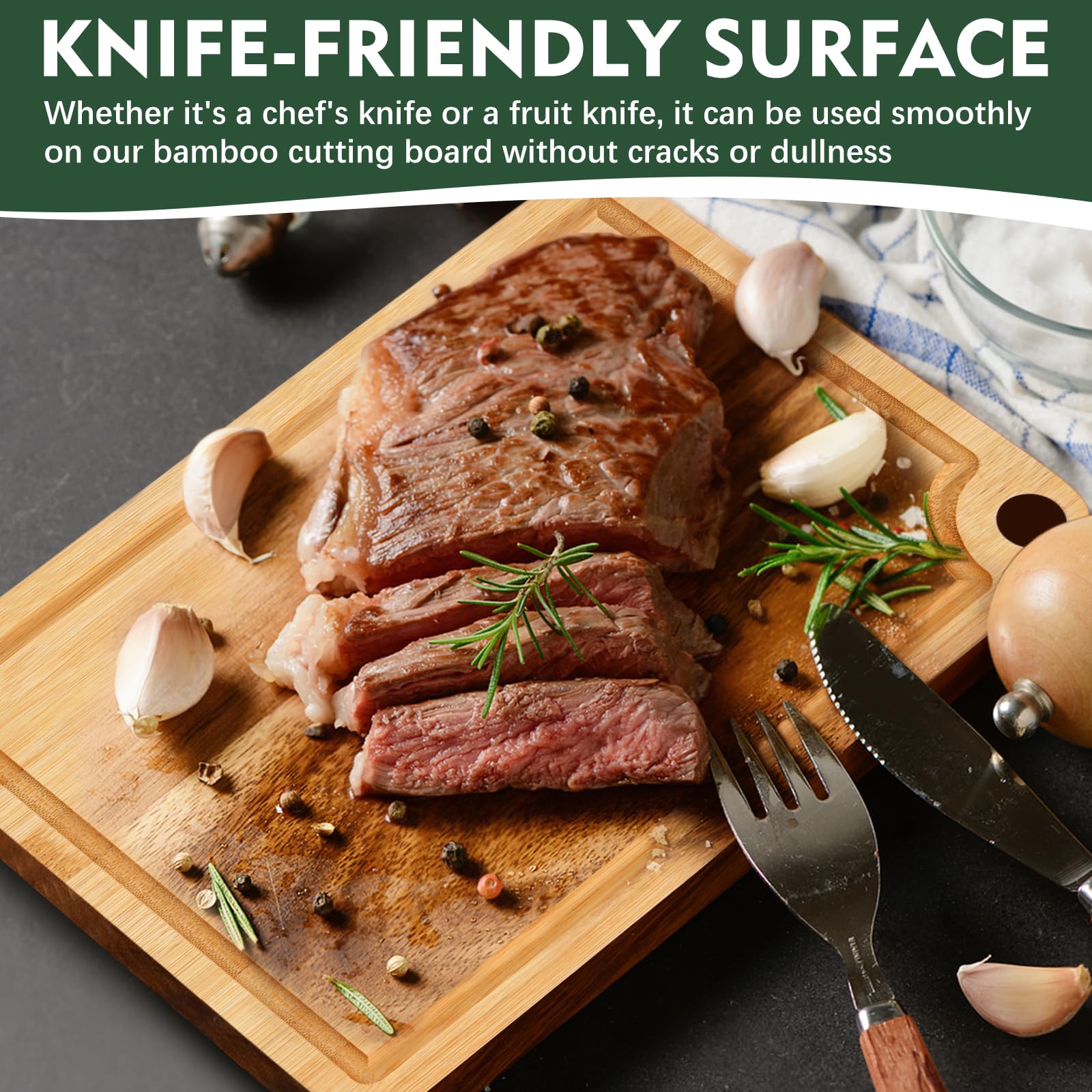 - 【Bamboo Surface, Protecting Knives】 The cutting board's bamboo surface is gentle and does not damage knives. Unlike other materials, bamboo will not dull or crack the knife, allowing your knives to stay sharp for a long time and reduces the trouble of frequent sharpening. Whether it's a chef's knife or a fruit knife, it can be used smoothly on our bamboo cutting board