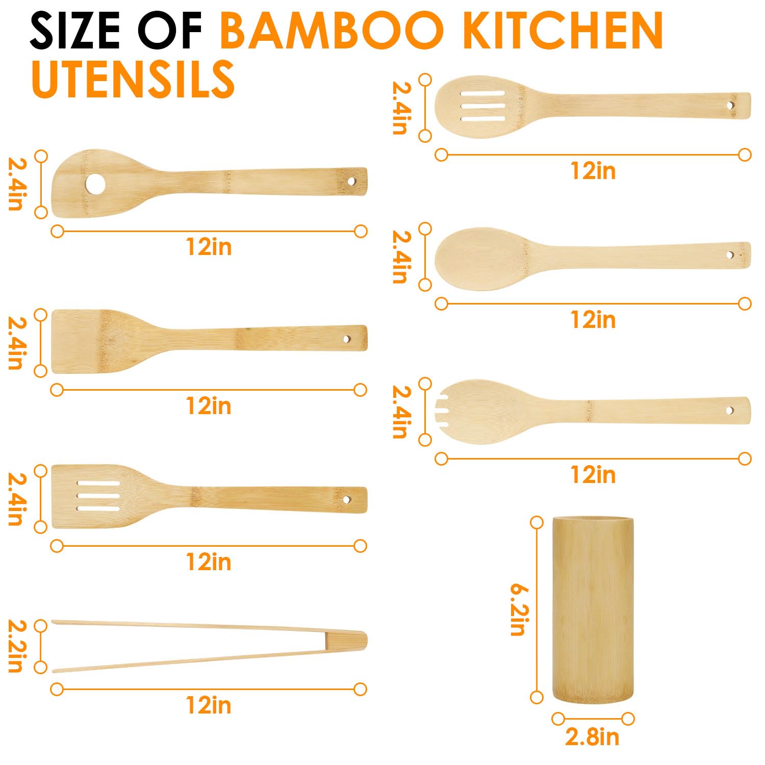 - 8PCS Bamboo Cooking Utensils Sets: The wooden utensils for cooking includes fried spatula, soup ladle, salad spoon, flat spatula, strainer spoon, slotted spoon, kitchen tongs. These wood cooking utensils set measure 12 inches in length. Wood kitchen utensils set can meet all your daily cooking needs and be wide used with various functions