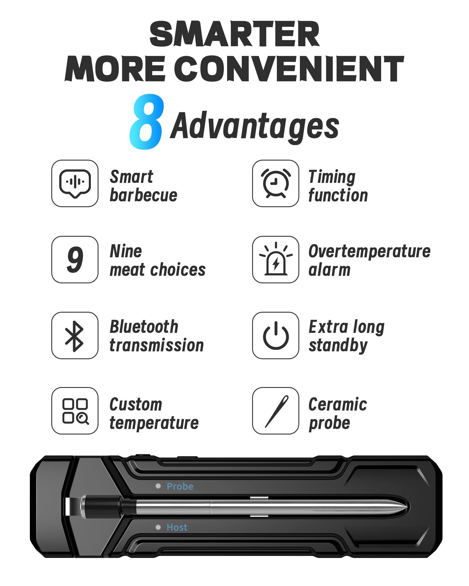 - 【SMART and MULTIFUNCTIONAL APP】 Our intuitive app makes monitoring your cook a breeze. Set your desired temperature, and receive real-time alerts when your food is ready. Thoughtful 9 meat types and doneness levels and supports custom timer and temperature, whether you're a seasoned griller or a novice chef, our wireless thermometer for grilling will guide you to culinary success