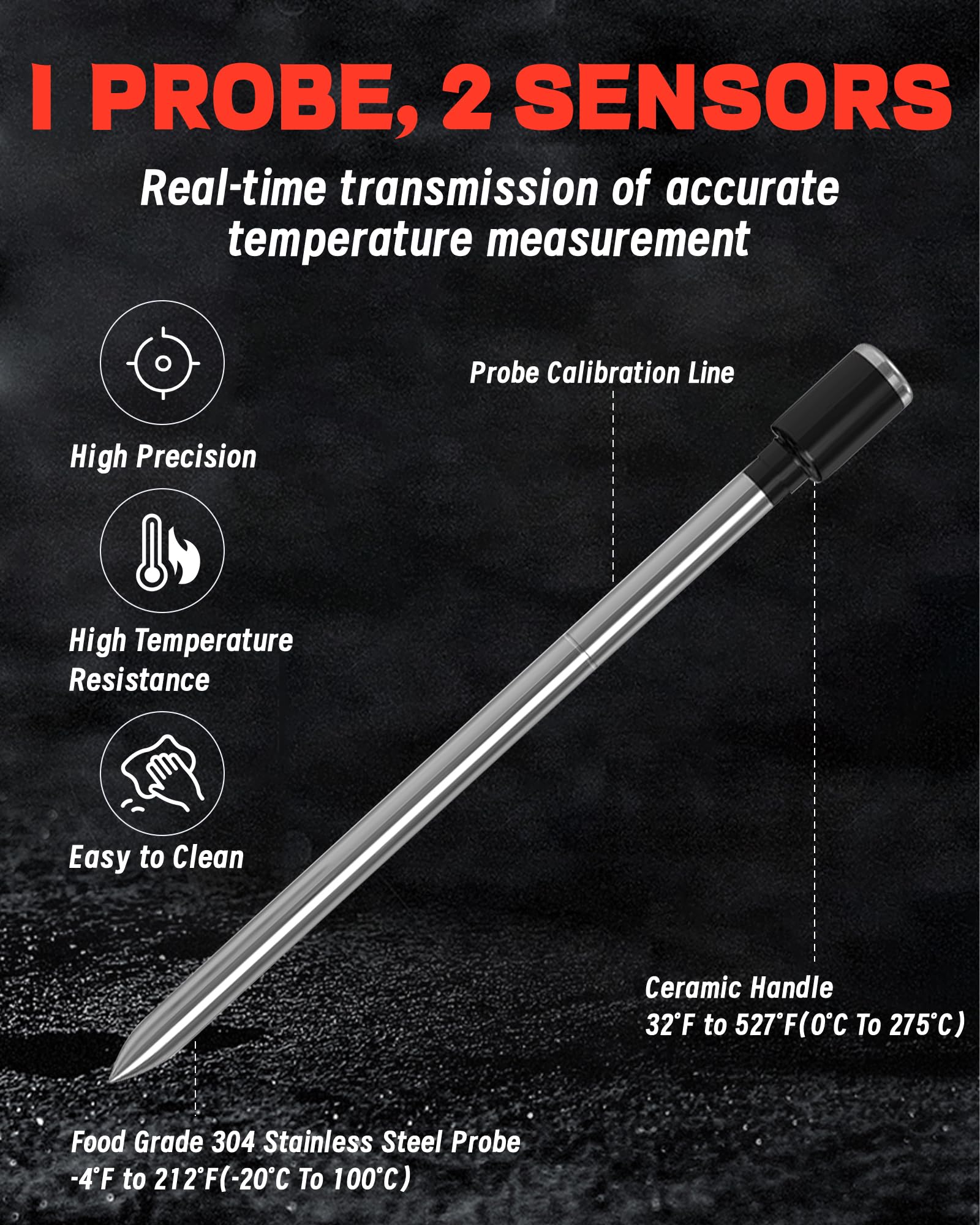 - 【FAST and ACCURATE】 Accuracy is our pursuit, our digital meat thermometer is equipped with features a meat temperature probe with two sensors that monitors both the internal meat temperature (up to 212℉) and the ambient temperature (up to 527℉) at the same time, while still reading highly accurately in just 2 seconds with an accuracy range of +/- 1.8℉. Whether you crave a tender, juicy steak or a perfectly roasted chicken, our thermometer will help you to achieve culinary perfection