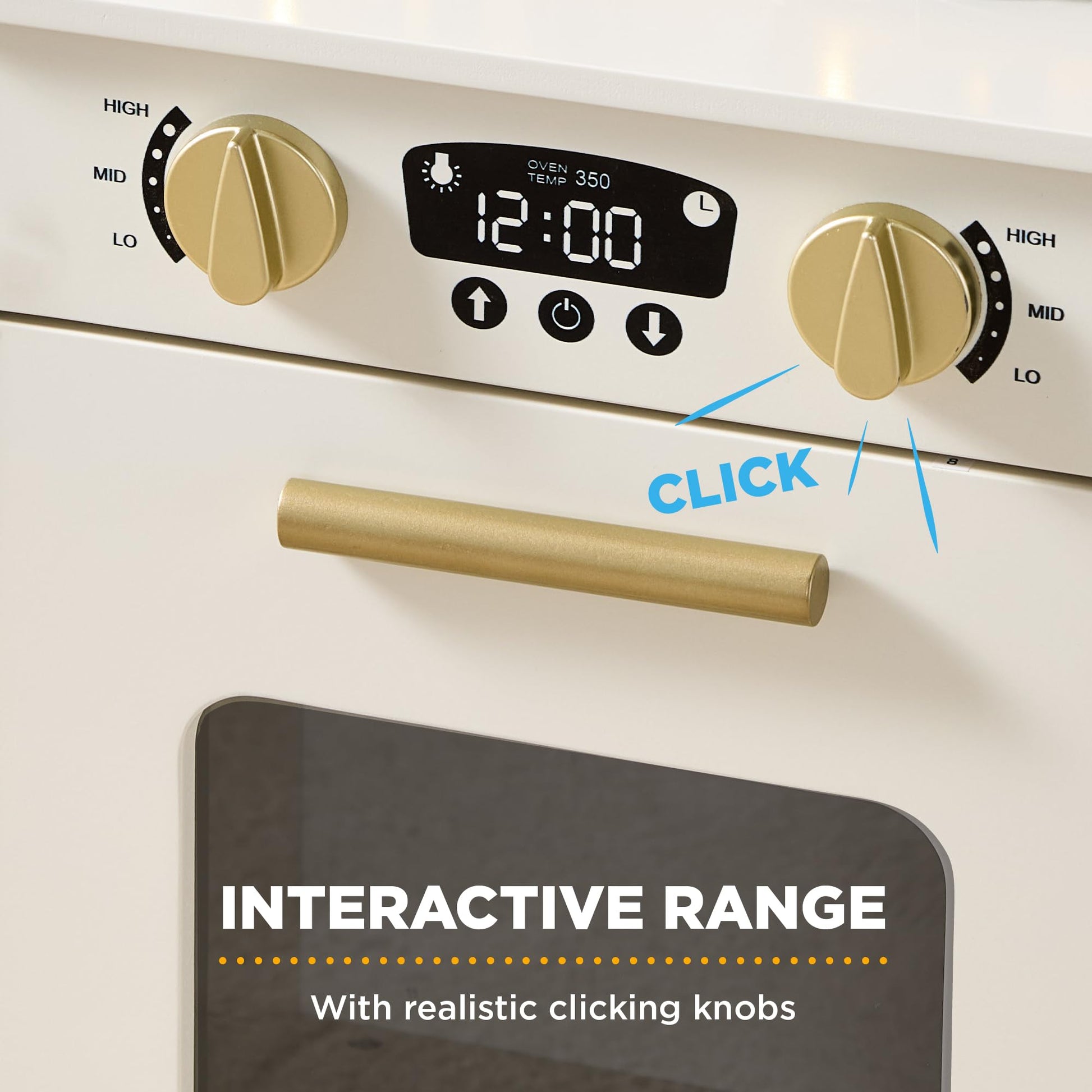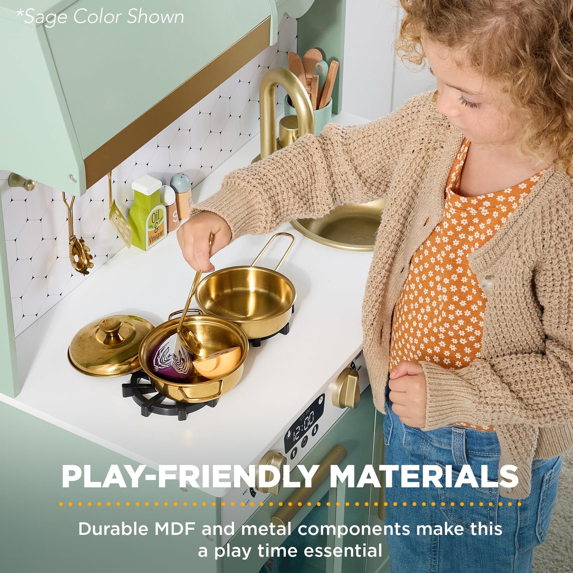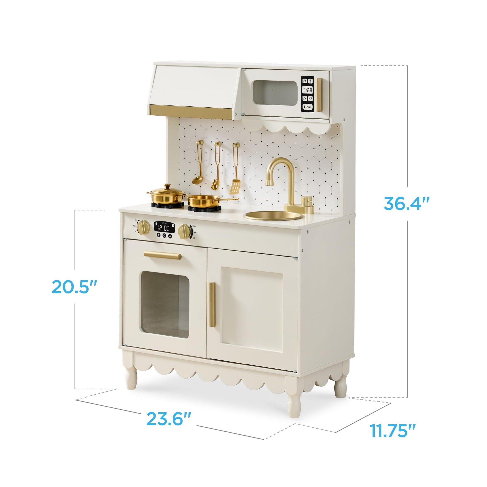 - COTTAGE KITCHEN DETAILS: This playset combines unique and charming details like scalloped edges with modern kitchen staples, including a play microwave, oven, and interactive clicking knobs