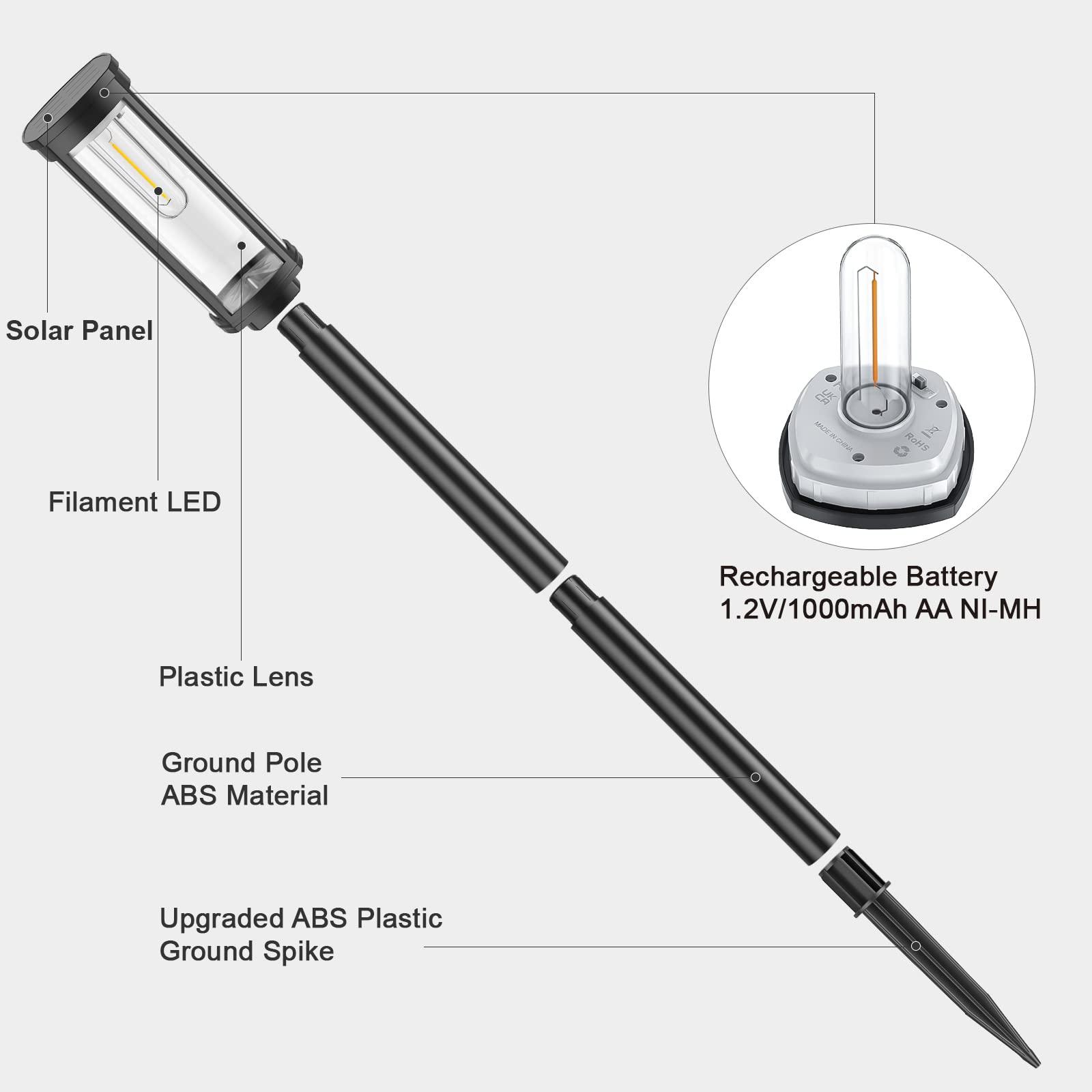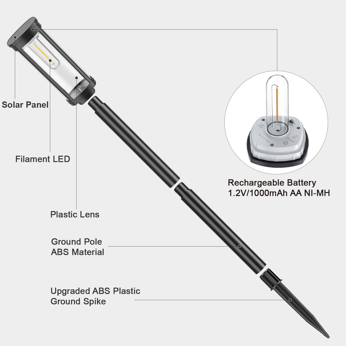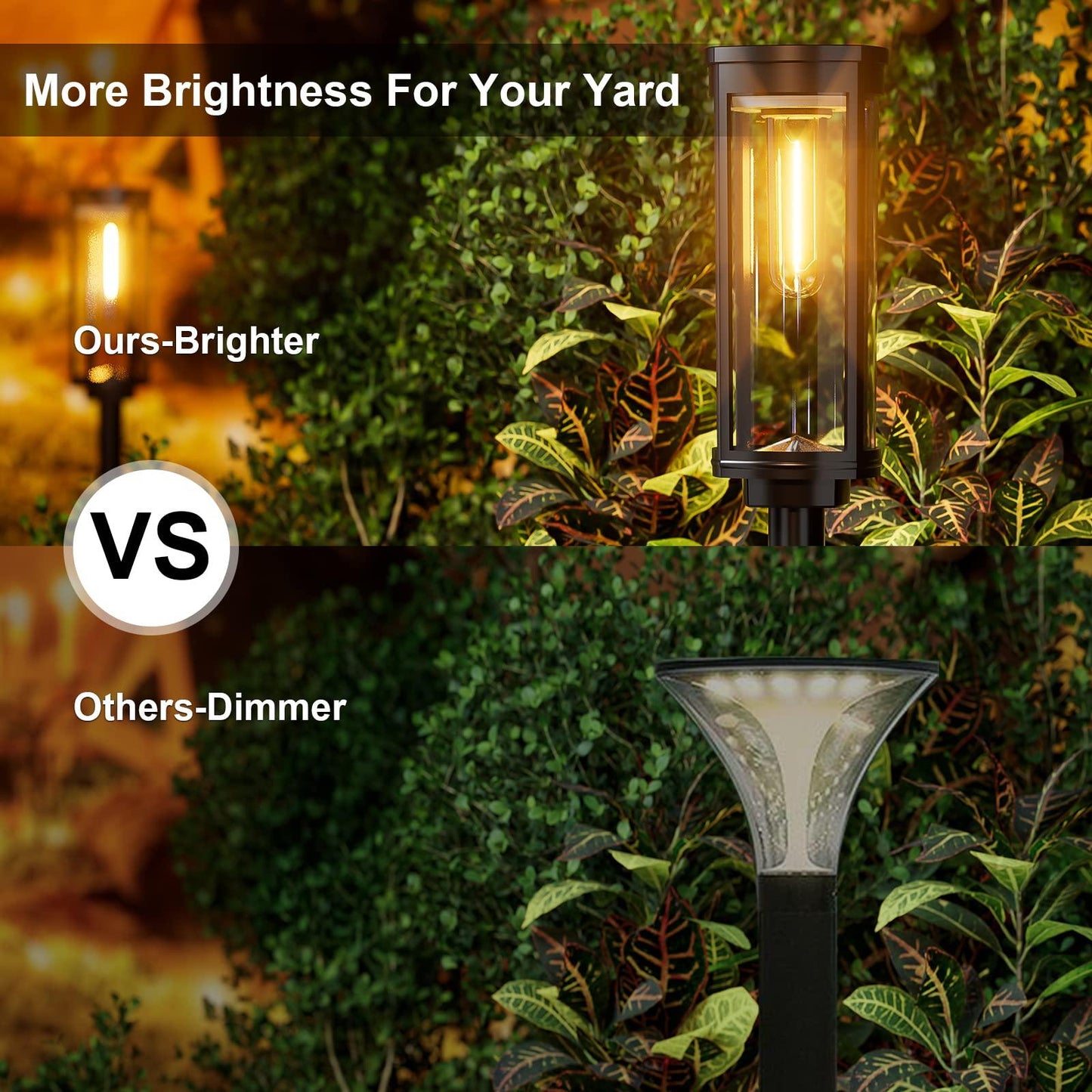 - RETRO DESIGN:Warm white tungsten filament bulbs put in high transparency lampshade,make our solar yard lights brighter than others,create a romantic and warmth atmosphere for your home.Please do not put the solar backyard lights in places with strong light at night.