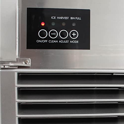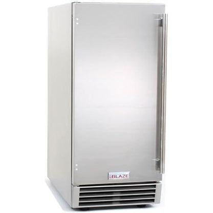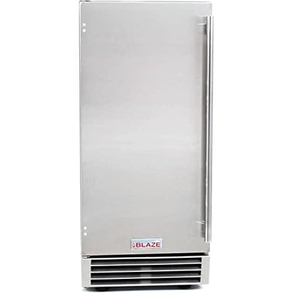 Details: Blaze 50 Lb. 15-Inch Outdoor Rated Ice Maker With Gravity Drain - BLZ-ICEMKR-50GR. BLZ-ICEMKR-50GR. Outdoor Ice Makers & Ice Machines. Outdoor entertaining is more enjoyable and convenient when you have everything in your outdoor kitchen. This outdoor ice maker eliminates unnecessary trips inside to get ice for your beverages. The unit is made from durable stainless steel and features a reversible door to suit your specific needs. The Blaze outdoor ice maker can produce up to 50 pounds of cube ice per day and can hold 25 pounds in its removable bin. Inside the ice maker, a cool blue LED illuminates the contents, making things easy to see. The ice maker also includes a self cleaning mode and convenient one button operation. The Blaze ice machine features an in-line water filter which filters out impurities, ensuring the ice production is free of contaminants. The front venting design allows it to be used in a built-in application, or it can be used as a freestanding unit. The bottom of the ice maker is equipped with four leveling legs for a perfect fit. It operates on environmentally friendly R134a refrigerant, carries an Energy Star rating and UL listing for outdoor use. This ice maker includes a stainless steel ice scoop, drain line and water line....