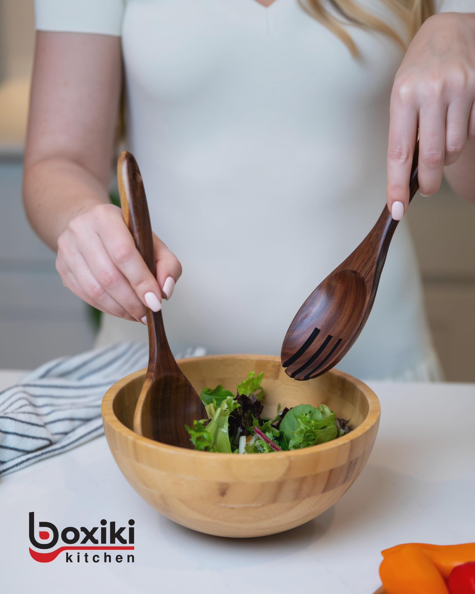 - FSC-CERTIFIED TEAK WOOD: Boxiki Kitchen wooden cooking utensils set is 100% handmade by natural teak wood without any coating, it is not a cheap bamboo utensil set. The handle of the wood spoons set is perfectly polished, which is smooth and lightweight, sturdy and without coated, and comfortable to hold