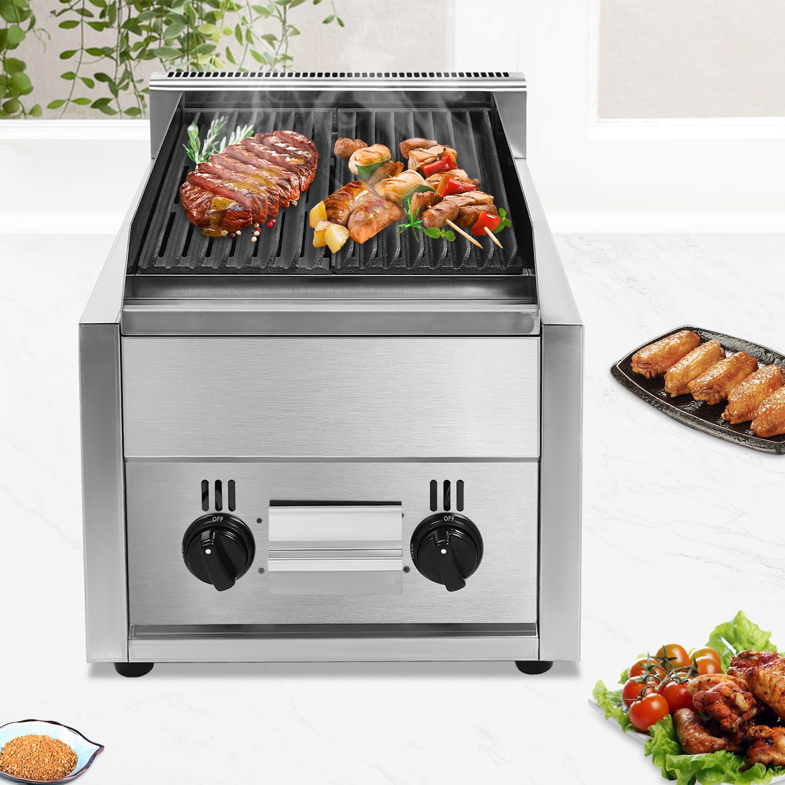 - Energy-saving and High Efficiency: This gas charbroiler has dual I-type burners, high-quality volcanic stone and cast iron grill can heat up quickly so that the food is evenly heated and gas is saved.