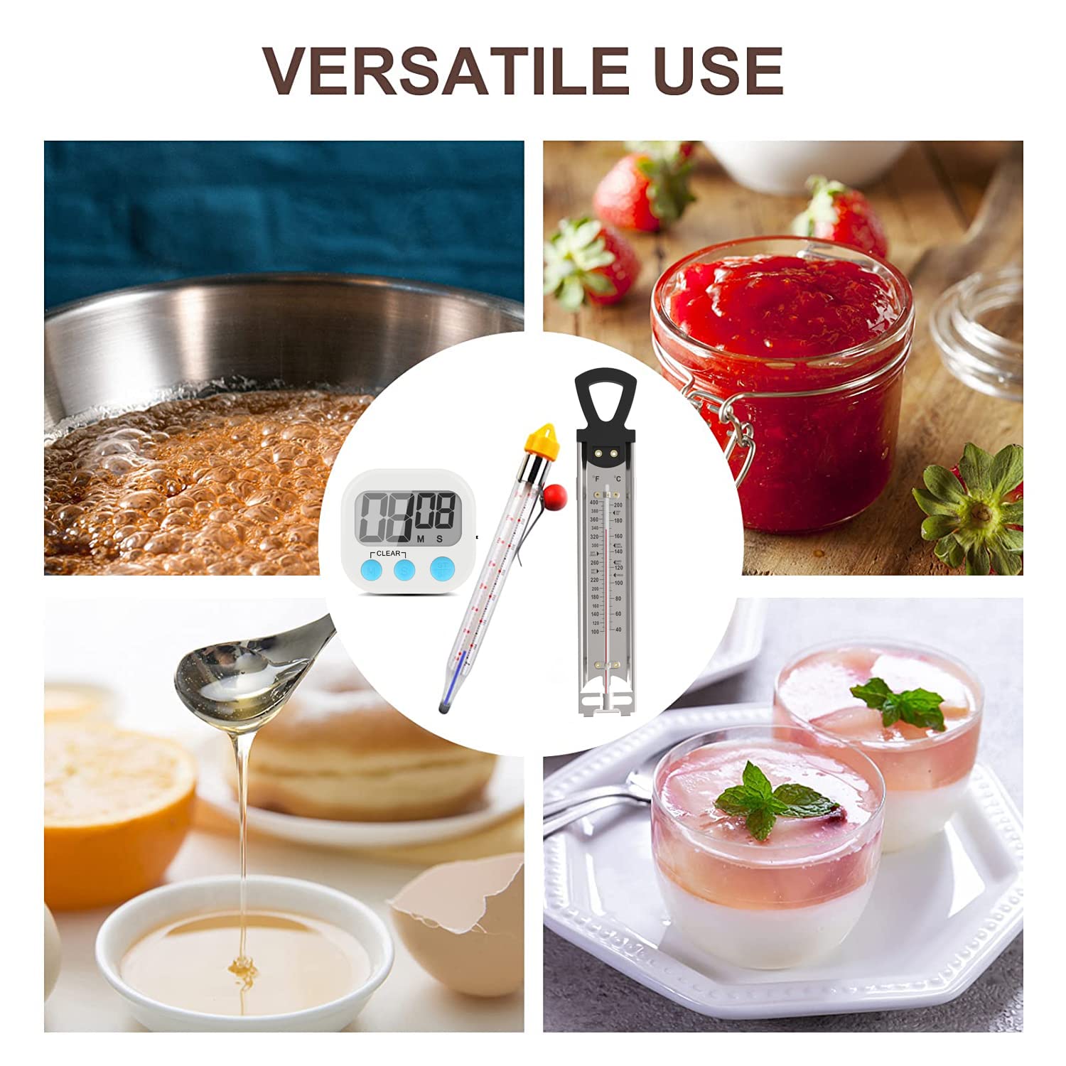 - 6 TEMPERATURE ZONES printed on display, large and easy-to-read quick references: Deep Fry, Thread, Soft Ball, Hard Ball, Soft Crack & Hard Crack stages.