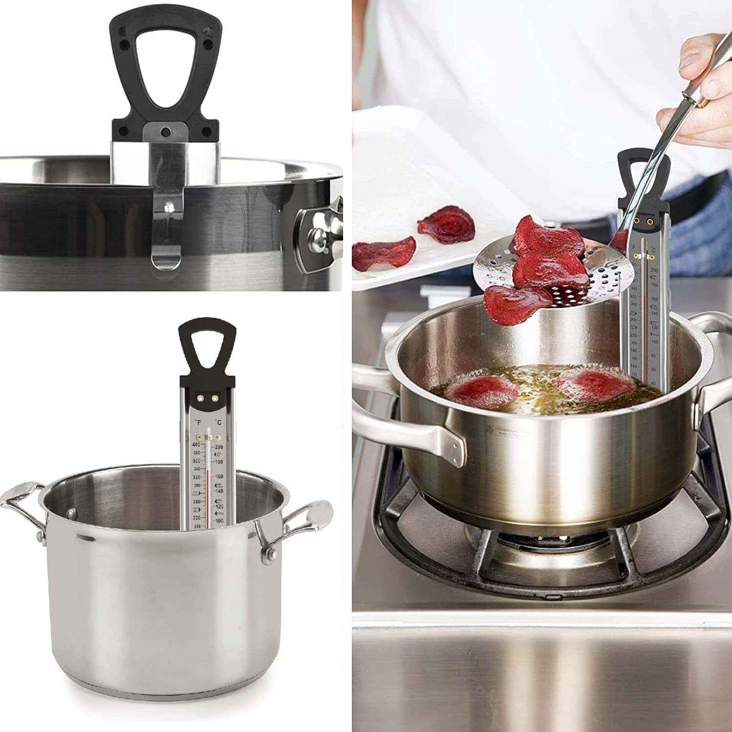 - POT CLIP ATTACHMENT clips to side of pot and securely holds thermometer in place for precise readings.
