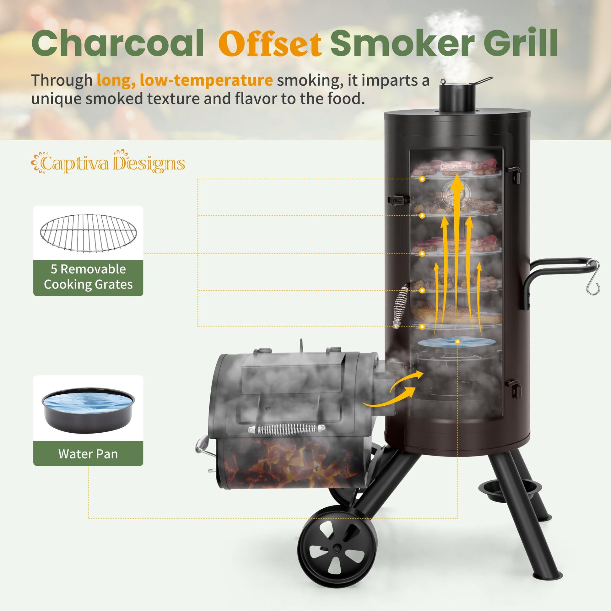 Captiva Designs Charcoal Vertical Smoker Grill and Offset Smoker Grill Combo, Extra Large Outdoor Barrel BBQ Meat Smoker with 5 Removable Smoking Grates & Built-in Hooks for Various Meat Foods