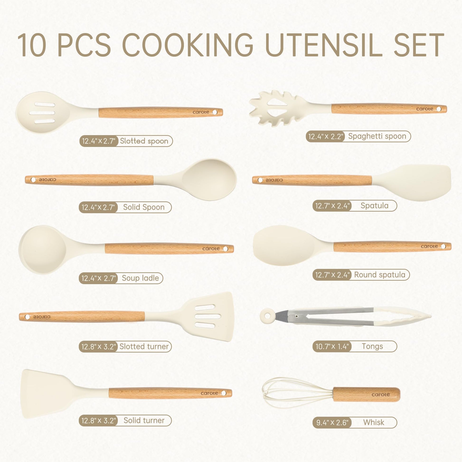CAROTE Silicone Cooking Utensils Set, Kitchen Utensils Set 10 Pcs for cooking, BPA Free Spatula Set with Heat Resistant Wood Handles for Nonstick Cookware (Cream White)