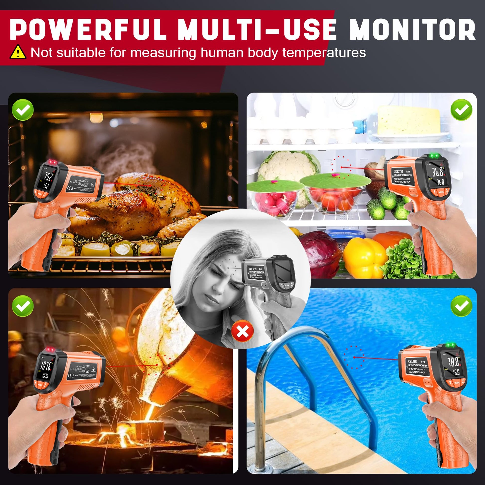 - NOT FOR HUMANS: This infrared temperature gun is not intended for use on humans or animals. It accurately measures the surface temperature of objects, liquids, pizza ovens, meats, grills, car engines, refrigerators, air conditioners and other objects.