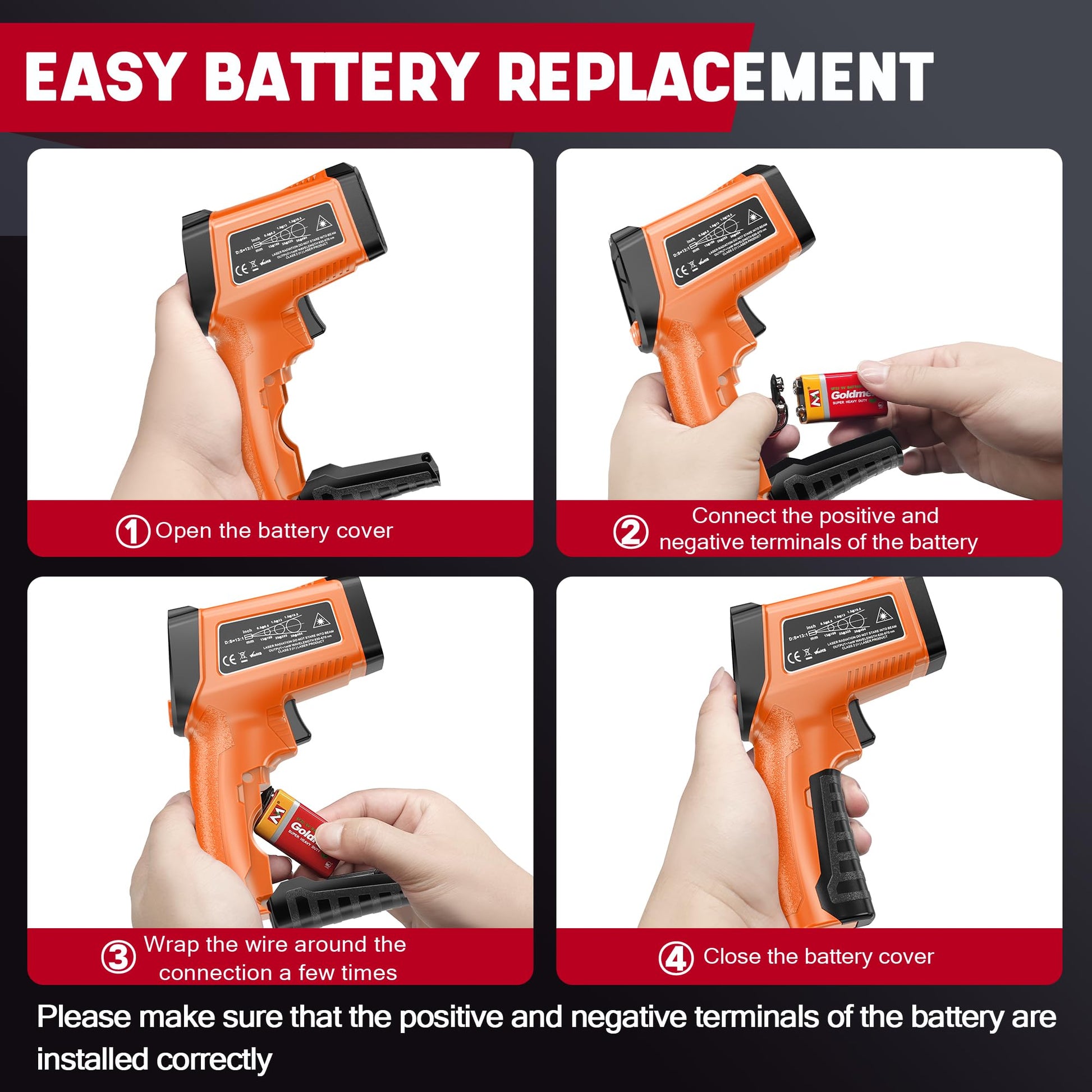 - HIGH TEMPERATURE RANGE: The Infrared Thermometer Gun is subjected to rigorous and precise calibration tests. Press the gun trigger to accurately measure the temperature anywhere in the range of -58℉ to 1076 ℉ (-50°C to 580℃). Accuracy: +/-2.0%. Response time: <0.5s.