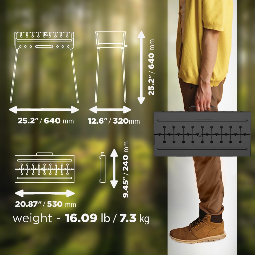 - Portable charcoal grill: dimensions of the grill when assembled for use are 20.8"L x 11.8"W x 20.8"H (53 x 30 x 53 cm) and weight 17,64 pounds (8 kg).When assembled for storage or transport, the grill is compact in size with a volume of only 0.27 cubic foot, so it can be packed and stored in a small kitchen, trunk or food truck to make the most of space.This large portable charcoal grill is made of very durable 2mm thick painted steel with high heat resistance. BBQ charcoal grill outdoor large.