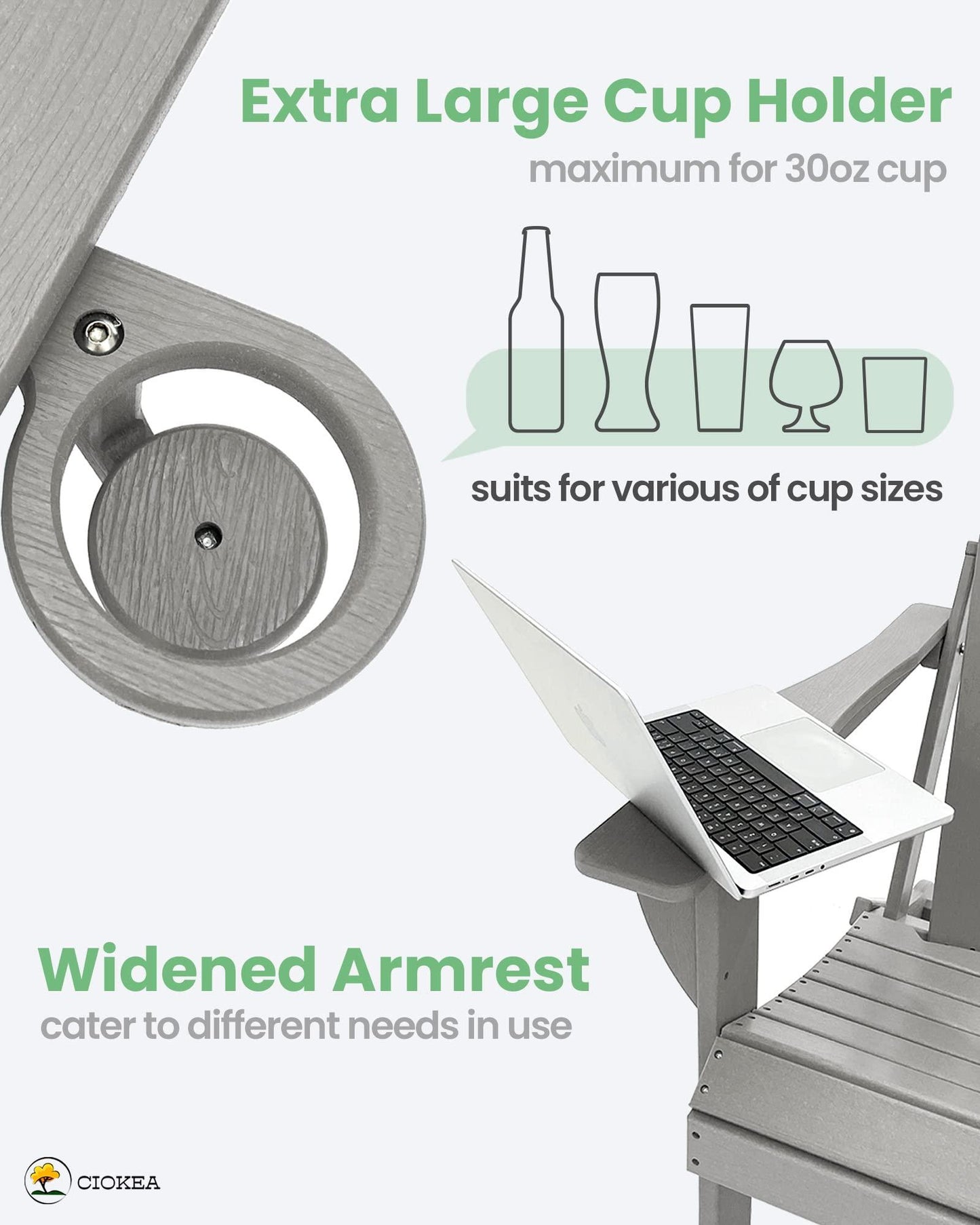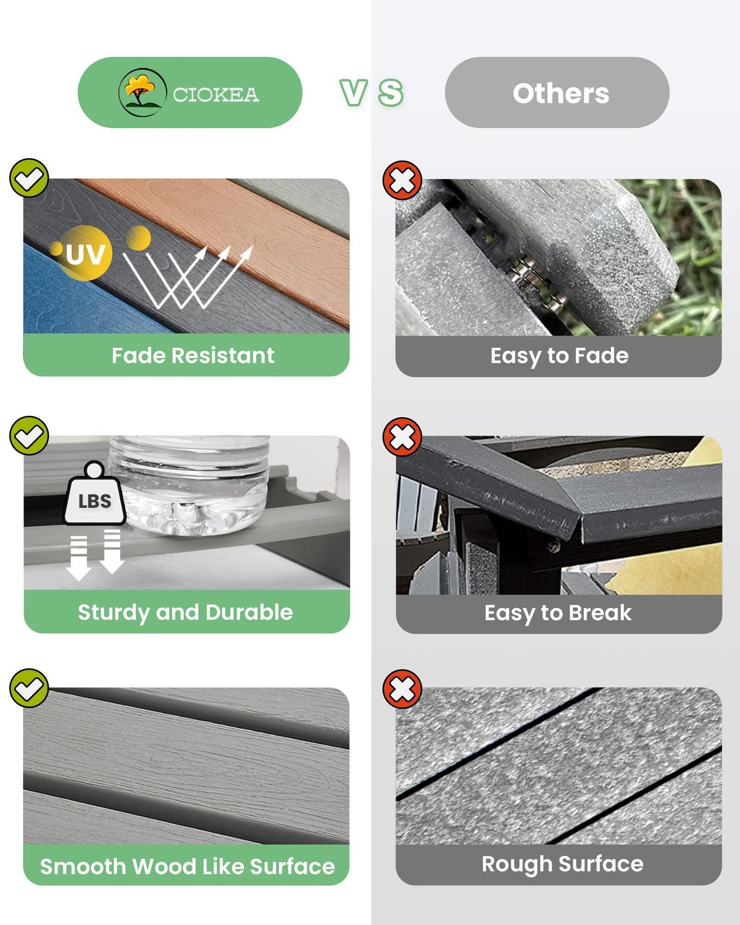 - Strong and Durable: Our plastic adirondack chairs are made of wood garin HDPE material, which is more resilient. When impacted by strong gravity, the CIOKEA HDPE plate will bend slightly and recover as the gravity disappears, while ordinary HDPE plate will bend severely and fail to recover, and HIPS plate will break. Ciokea Adirondack chairs can have a load capacity of 380LBS.