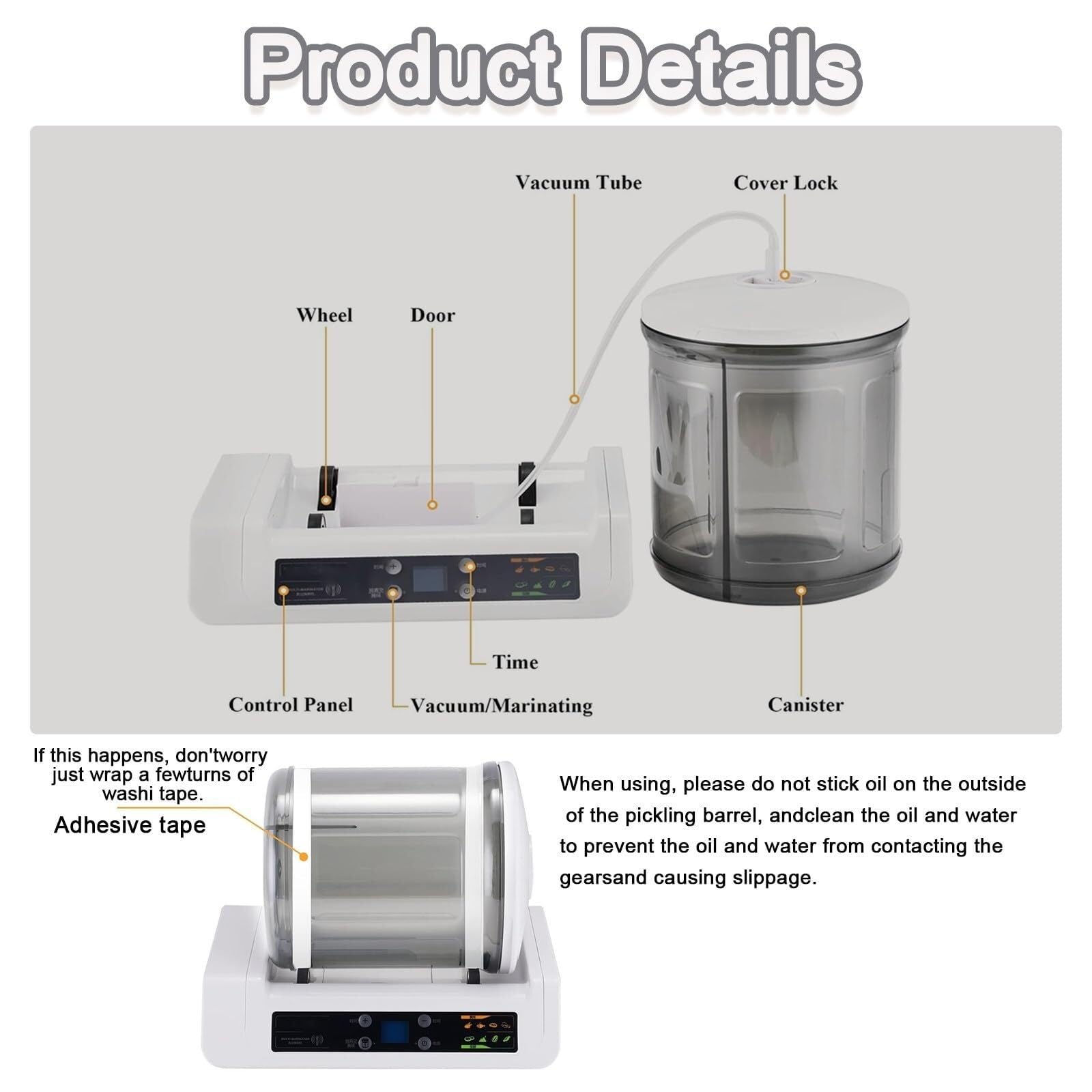 - 【Precautions】: When using a vacuum marinating machine to marinate meat and vegetables, please do not stick oil on the outside of the barrel, and remove oil and water. Oil and water contacting the gears will cause slippage