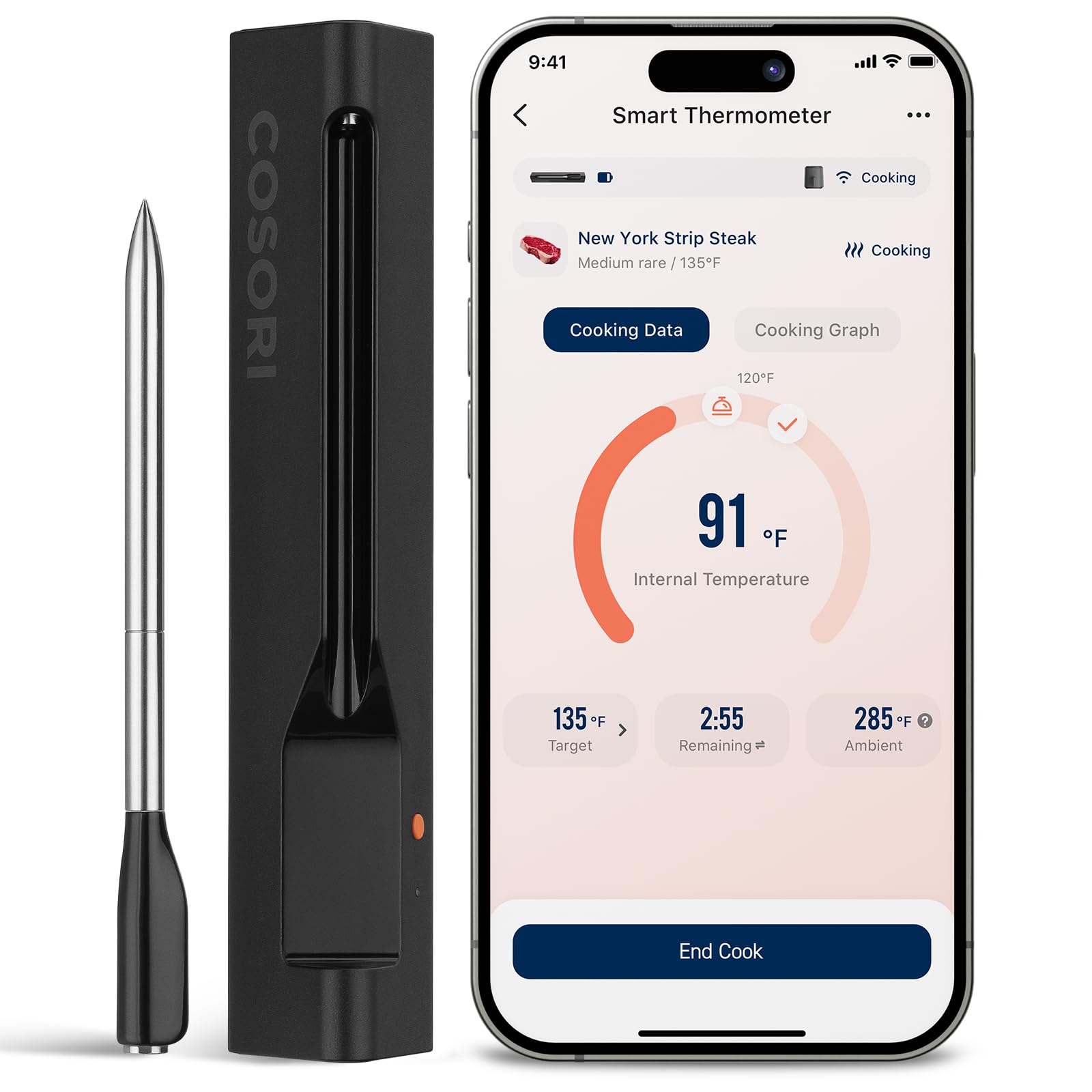 COSORI Wireless Meat Thermometer Digital, Bluetooth Food Thermometer for Grill, Smoker, Oven, Air Fryer for Turkey, Chicken, Steak, Gifts for Men, 90+ Recipes in Free App