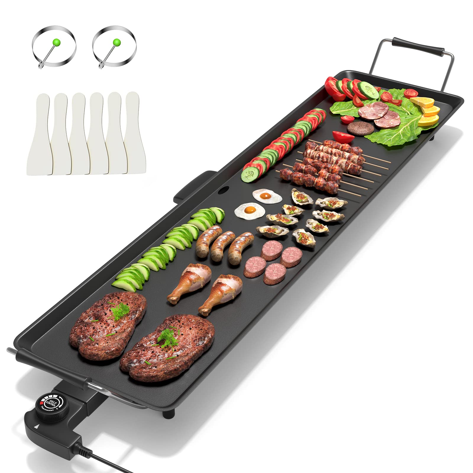 - 【Quality Build and Comprehensive Accessories:】Constructed from high-quality aluminum with non-slip feet, ensuring a stable and wobble-free Teppanyaki grill on any countertop. The grill includes an array of accessories: 2 egg rings and 6 wooden spatulas, encouraging everyone to join in the cooking process.