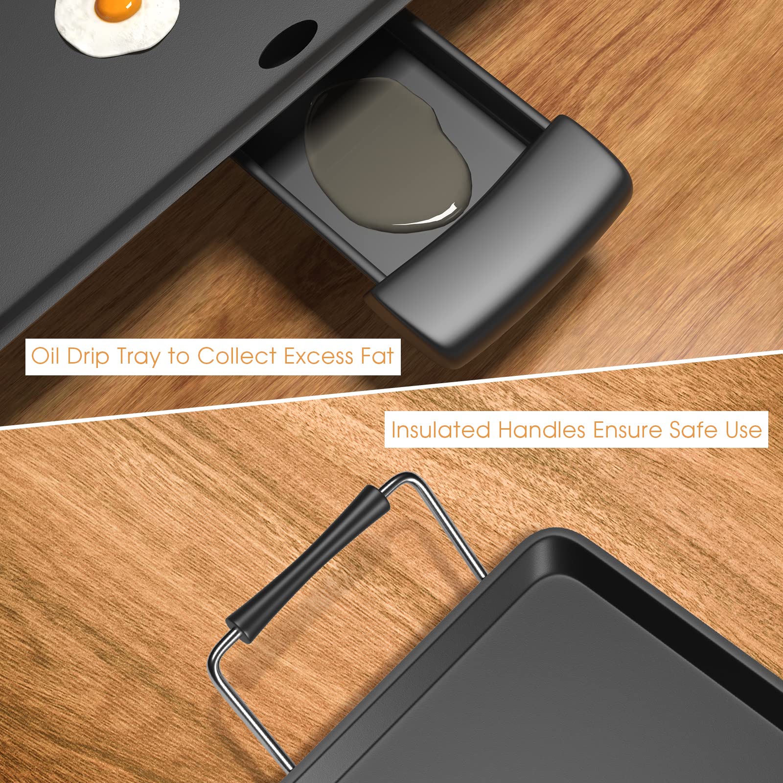 - 【Effortless Maintenance with Non-Stick Surface:】The enhanced non-stick surface retains and distributes heat excellently, ideal for preparing breakfast staples like pancakes and eggs. Its smooth Teflon coating ensures easy food removal and cleaning, promoting a healthier cooking experience compared to traditional grills. The removable drip tray facilitates dishwasher-safe cleaning.