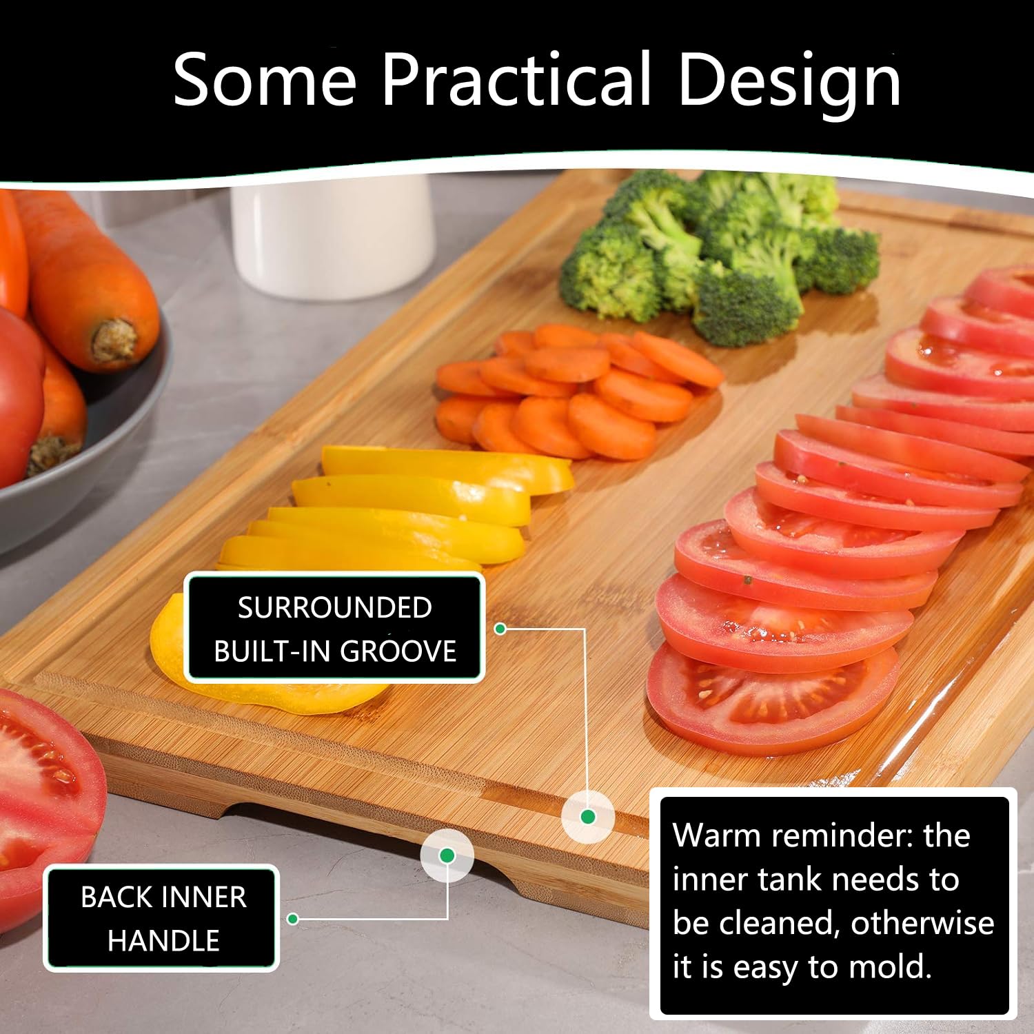 - ♥Detailed Design: Our bamboo boards have grooves on the surface, which are designed to prevent meat, fruit and other juicy moisture liquids from flowing out. There is also extra space under the two sides of bamboo cutting board for handrail ends, which can also help people better distinguish between the front and back.