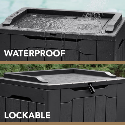 - [Light & Solid] Made of a high density resin material, it is stable, waterproof and UV resistant. The net weight of this deck box is only 8.8 pounds, so even a child can easily carry it.