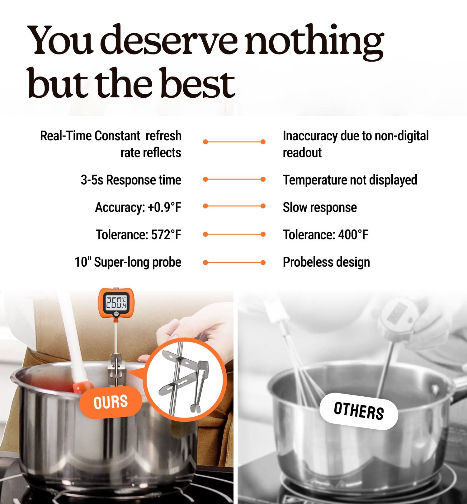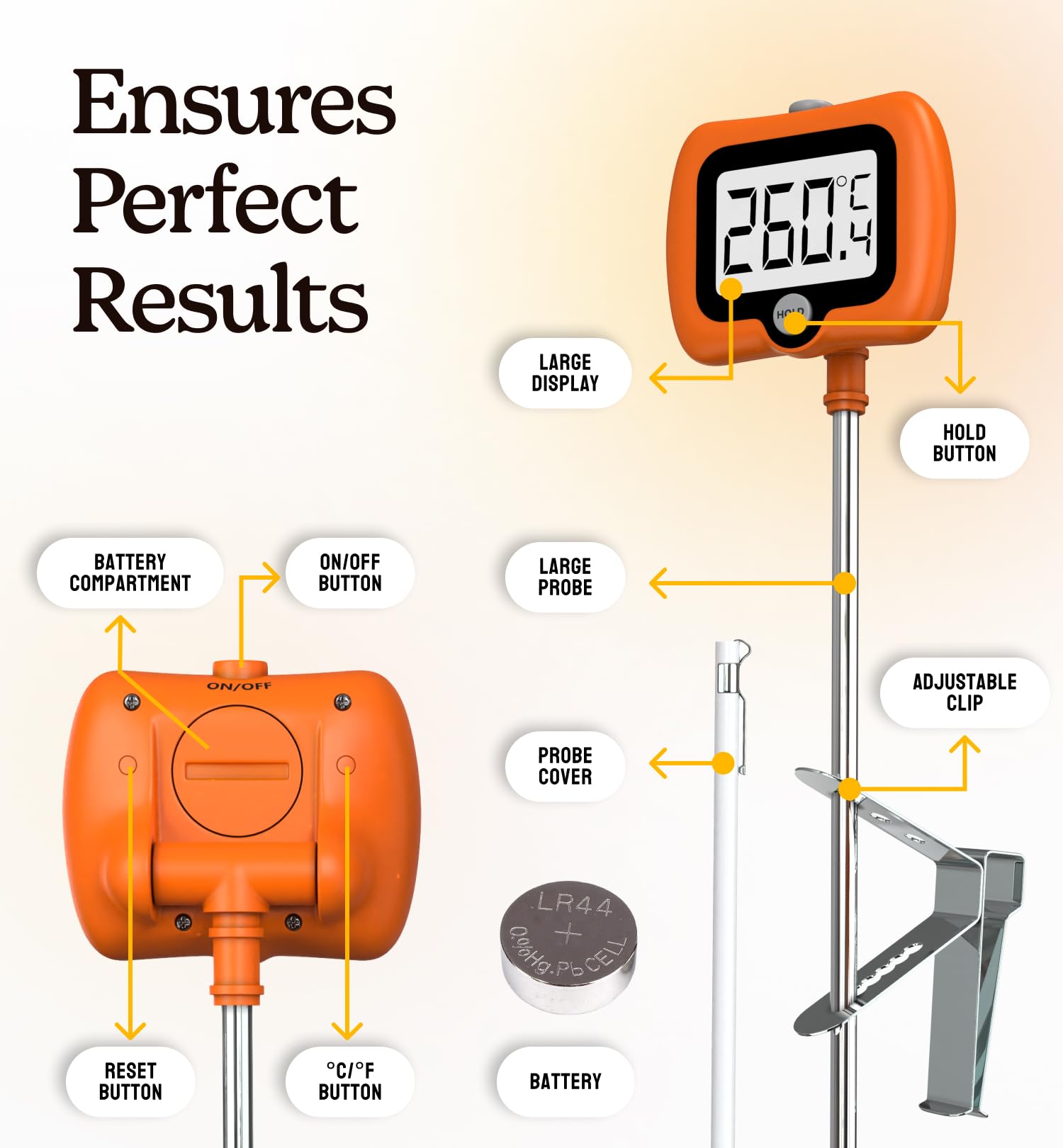 - Pot Clip Design for Safer Operation: This candy thermometer digital with clip can be fixed to the pot so you can free your hands to focus on the cooking, and protect your hands from the hot