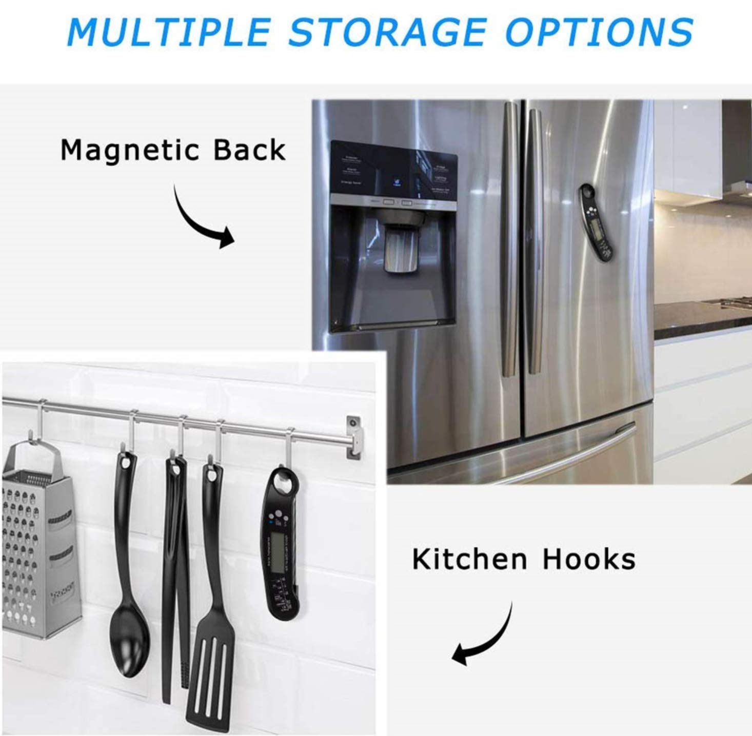 - CONVENIENT AND EASY TO USE: Large screen with optional backlight for clear reading, °F/°C switch, hold temperature function, calibration, automatic on/off when you flip the probe and automatic shutoff after 3 min of inactivity for a prolonged battery life, built-in bottle opener and magnet for storage