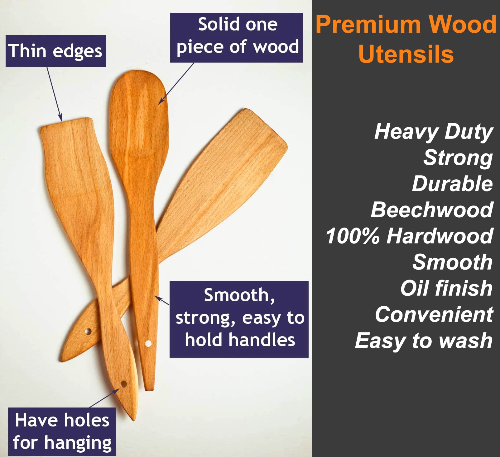 - 100% NATURAL, ECO-FRIENDLY, HEALTHY wood utensils set. These beechwood spoons are perfectly sanded and smooth. Includes stir fry, wok and pancake spatula, and egg turner. These healthy wood kitchen utensils are perfect for mixing, stirring, turning, and serving.